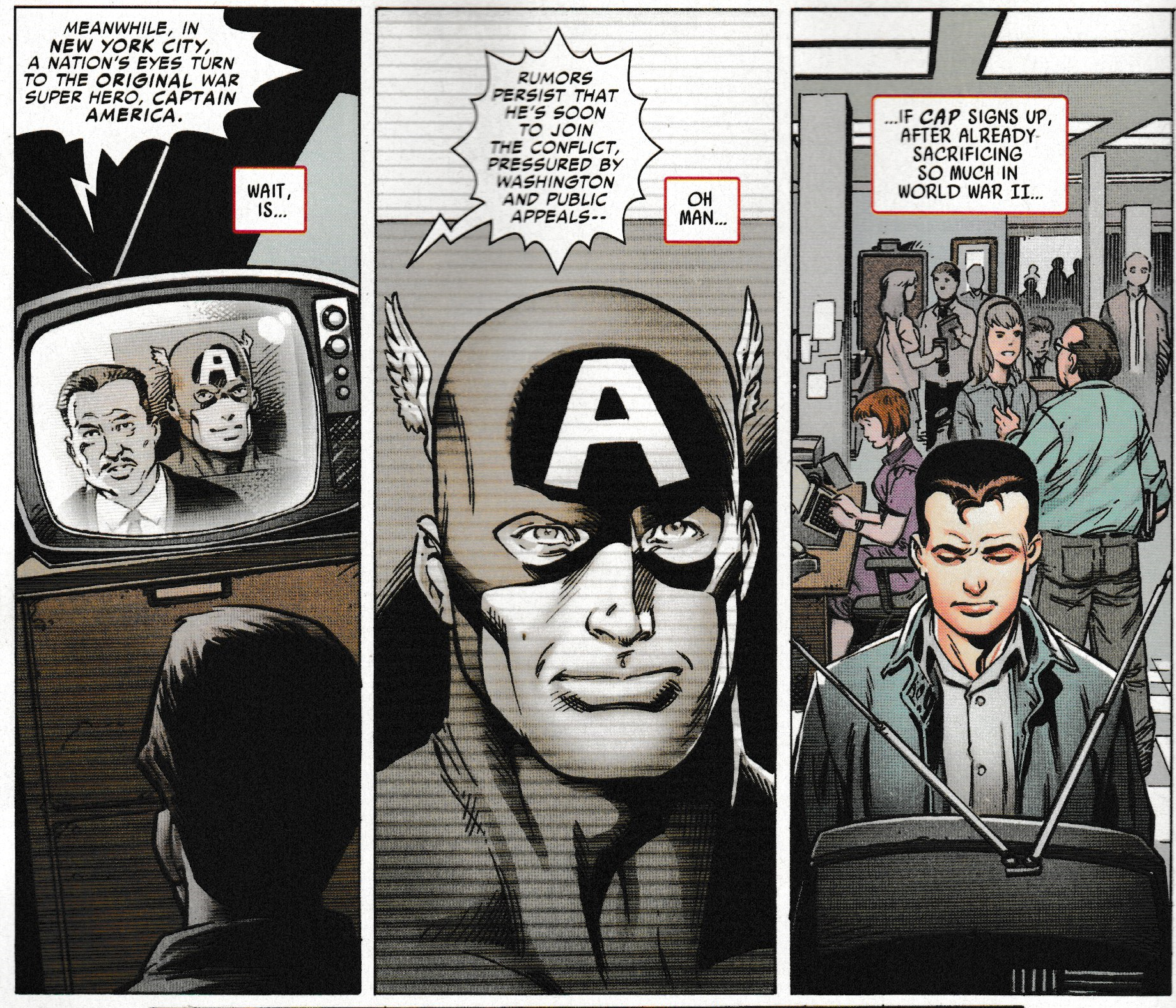 And even a cynical stab at Captain America – which gets a lot more cynical by the end of the first issue.
