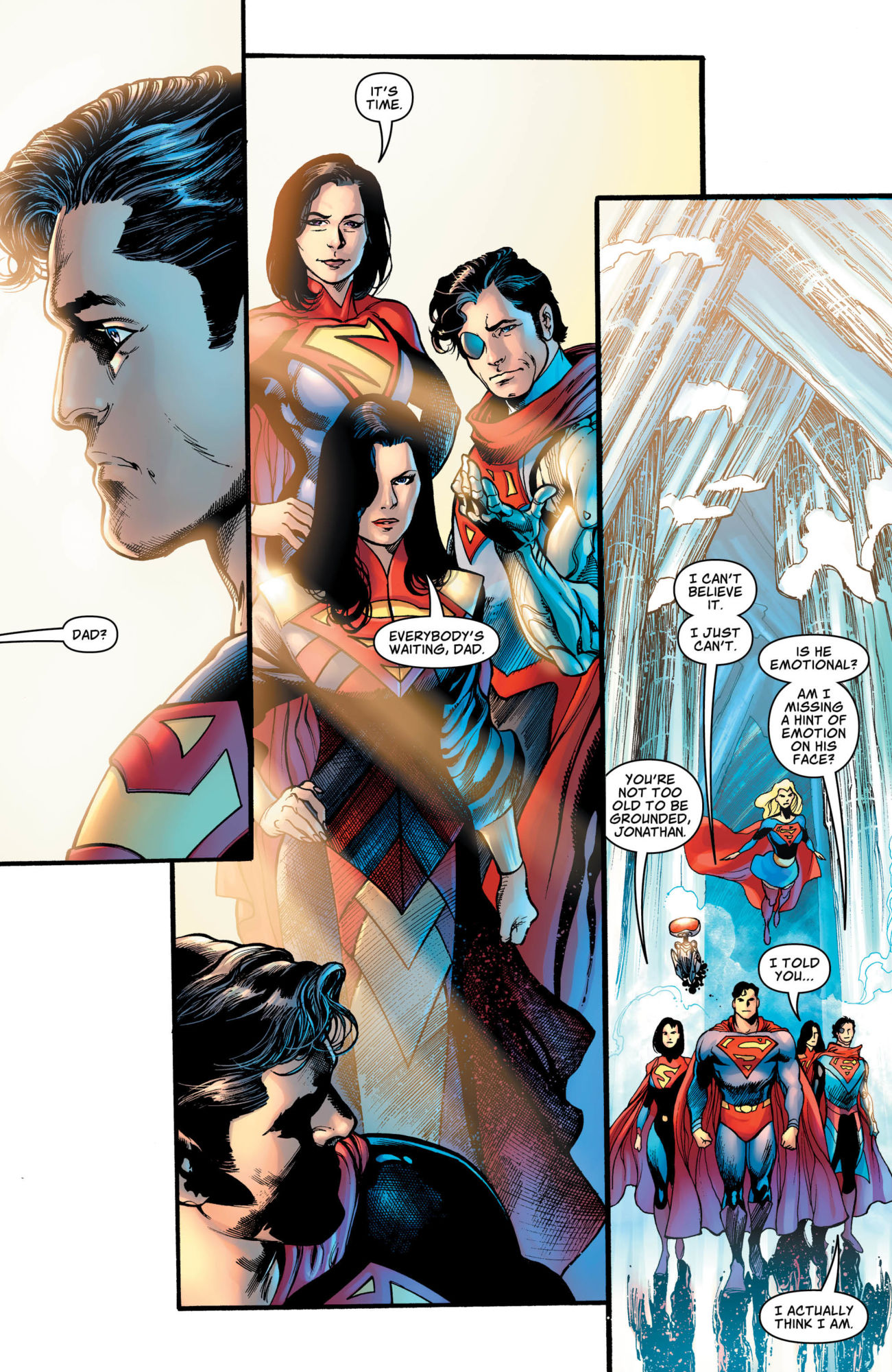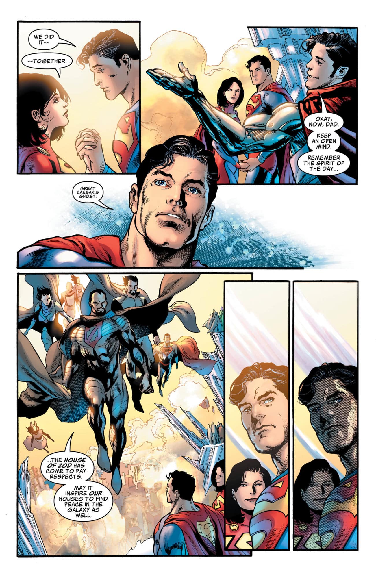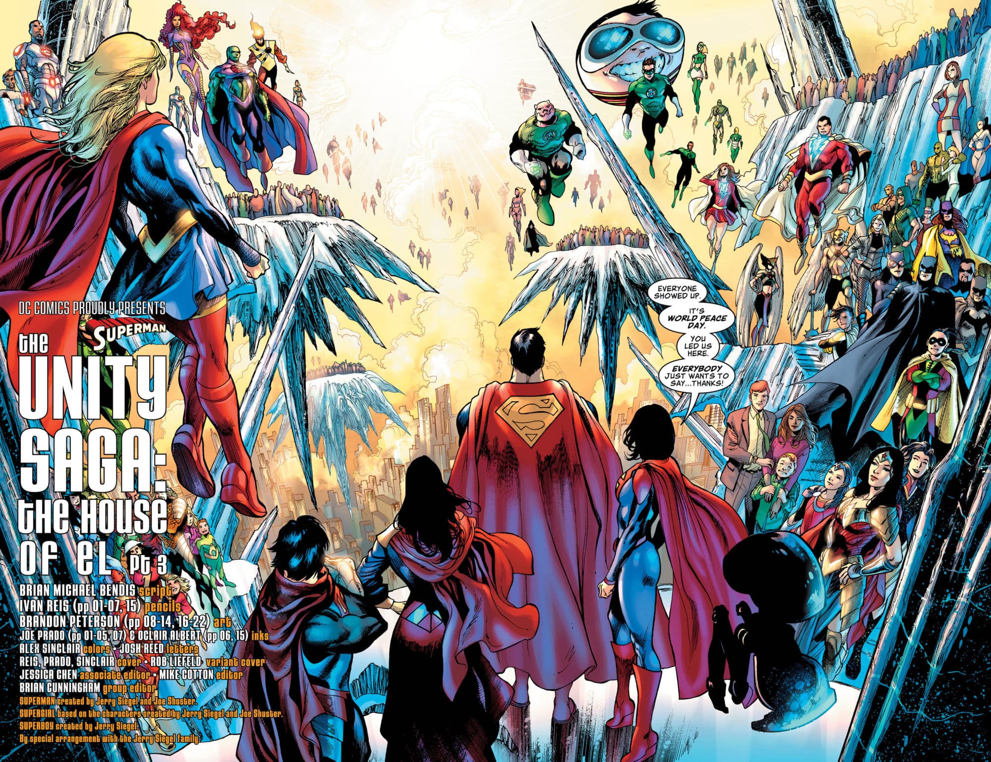 DC Comics has released a preview of Superman #9, the next chapter in "The Great One" Brian Bendis's Unity Saga storyline. In this issue, Superman, his wife, son, and daughter attend a ceremony to celebrate World Peace Day, commemorating everyone's agreement to stop making war and adopt Superman's philosophies of peace.