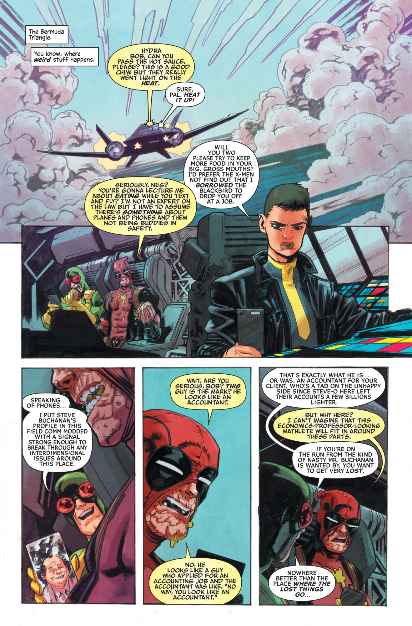 In Deadpool #4, the Merc with a Mouth is heading off on a new mission, having successfully advertised his new mercenary business by arranging for a world-threatening invasion by Groffon the Regurger in the book's opening storyline. But where is he headed? To a locale recently featured in a comic from the Distinguished Competition: The Bermuda Triangle.