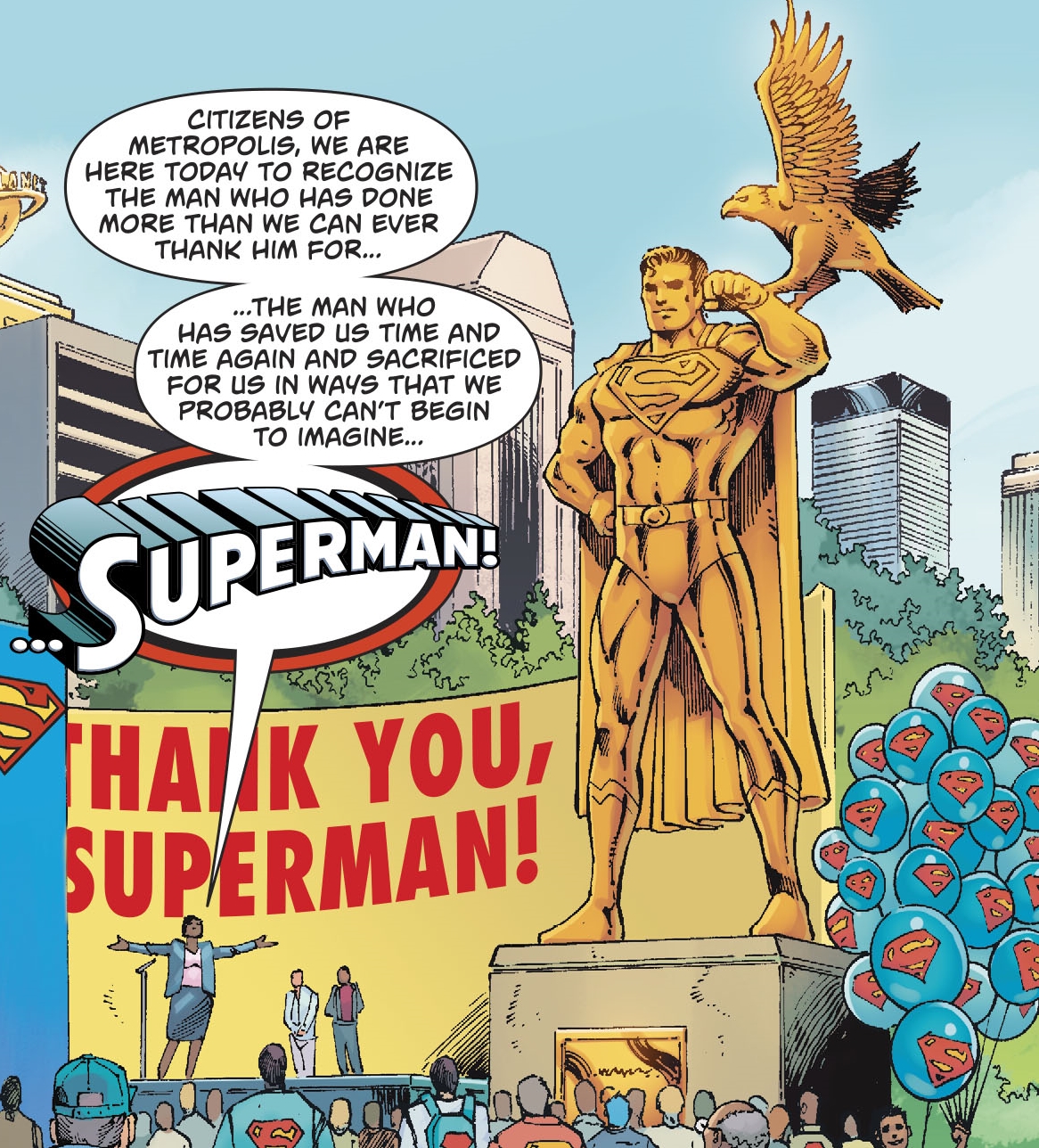 And so we get to see Centennial Park in Metropolis, complete with the Superman statue with Golden Eagle.