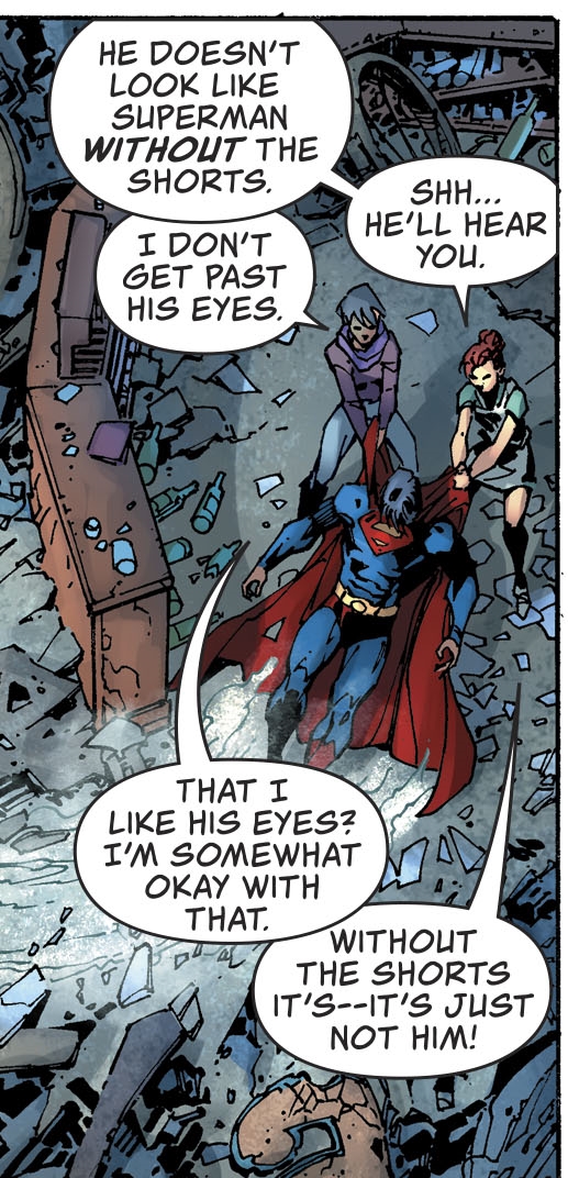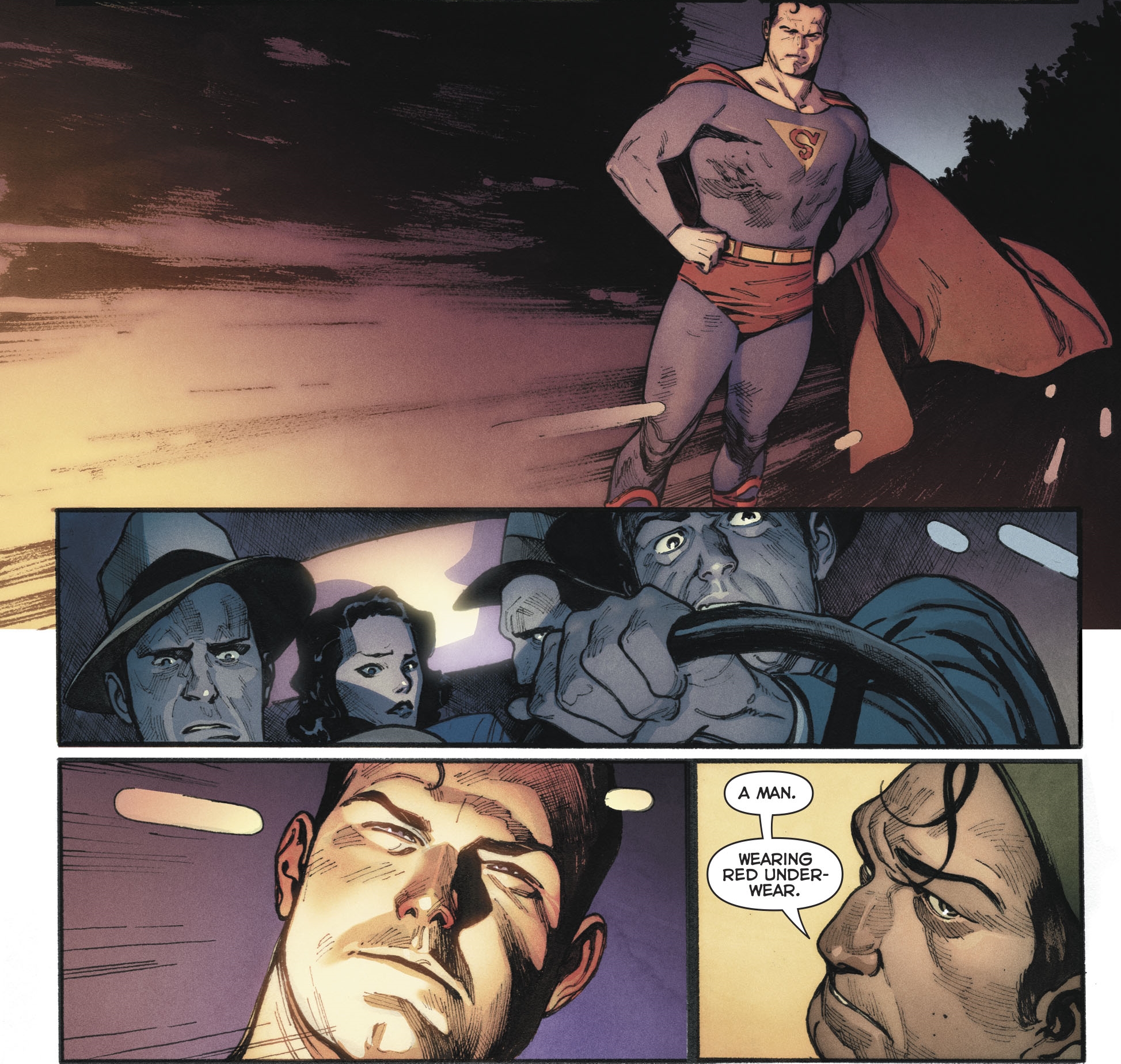 Oh, look, reading Action Comics #1000 is going to be full of things that don't fit. But the only moment that Superman is seen without the trunks is in flashback from Tomasi and Gleason…