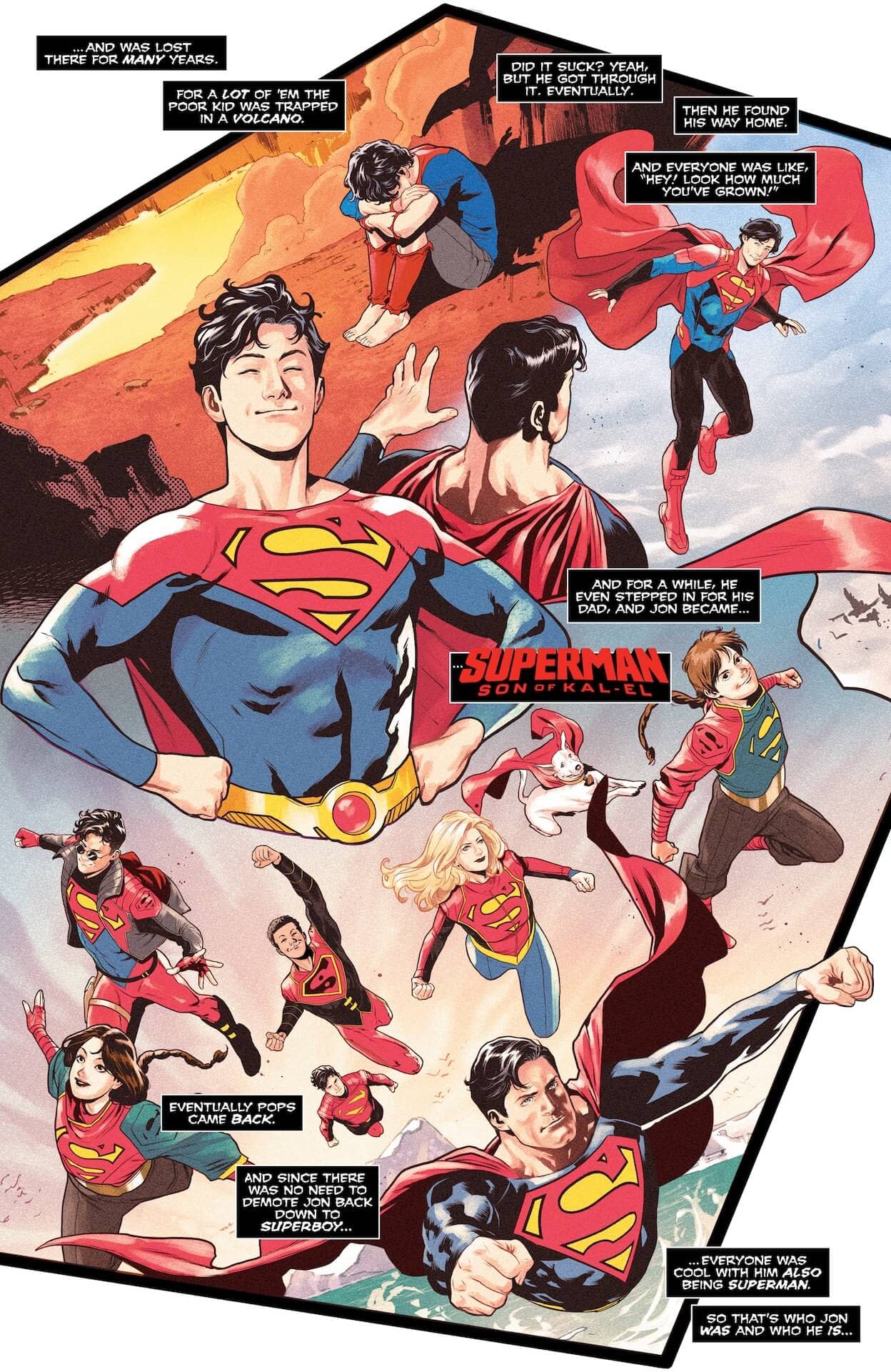 - Preview pages show Jon's journey from birth to Superman, with the mysterious return of Superboy promised in this issue