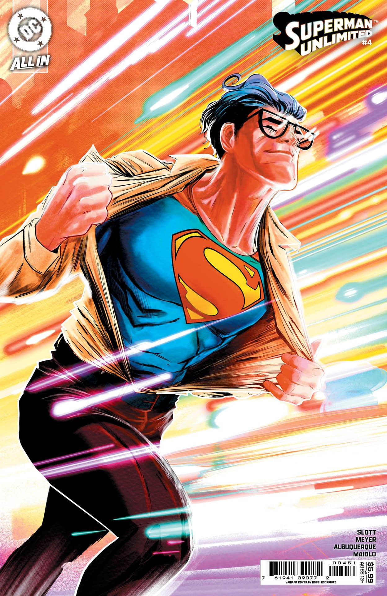 - Cover image for 0625DC070 Superman Unlimited #4 Robbi Rodriguez Cover, by (W) Dan Slott (A) Rafael Albuquerque (CA) Robbi Rodriguez, in stores Wednesday, August 20, 2025 from DC Comics