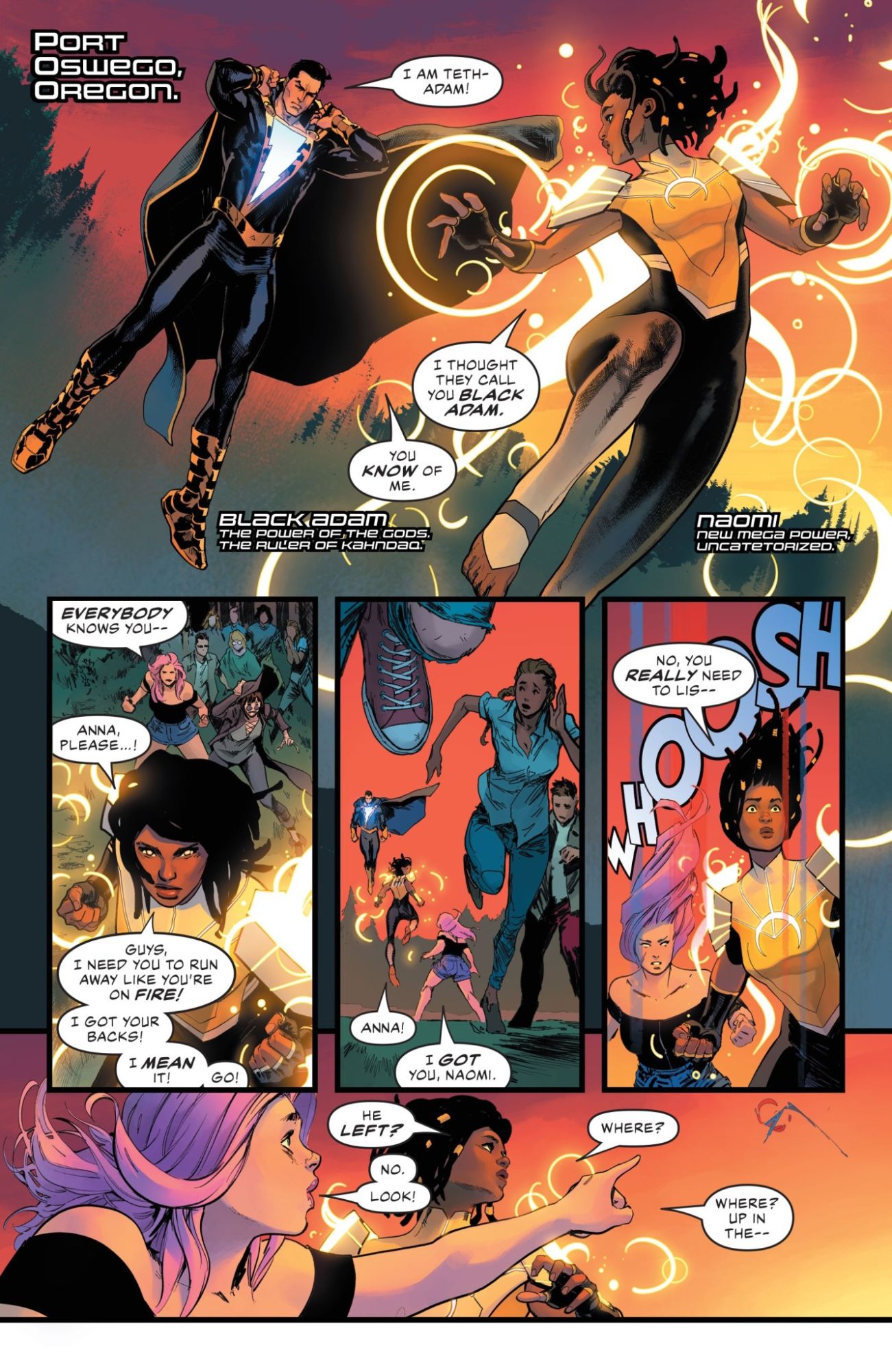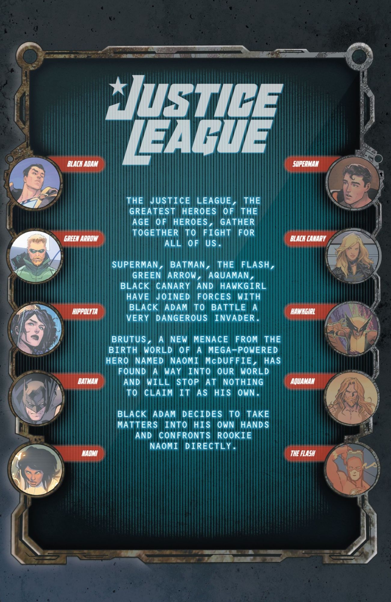 Superman, Batman, Green Arrow, Black Canary, Aquaman, and Hawkgirl join forces with Black Adam to fight an all-new world conqueror! But how do they stop the unstoppable power known as Brutus? Enter new mega-power sensation Naomi, who comes face to face with the League and brings along Queen Hippolyta of the Amazons for a blockbuster battle for the ages—with a last-page cliffhanger that will leave everyone guessing what's next!