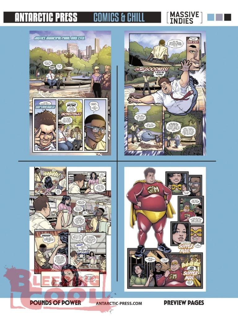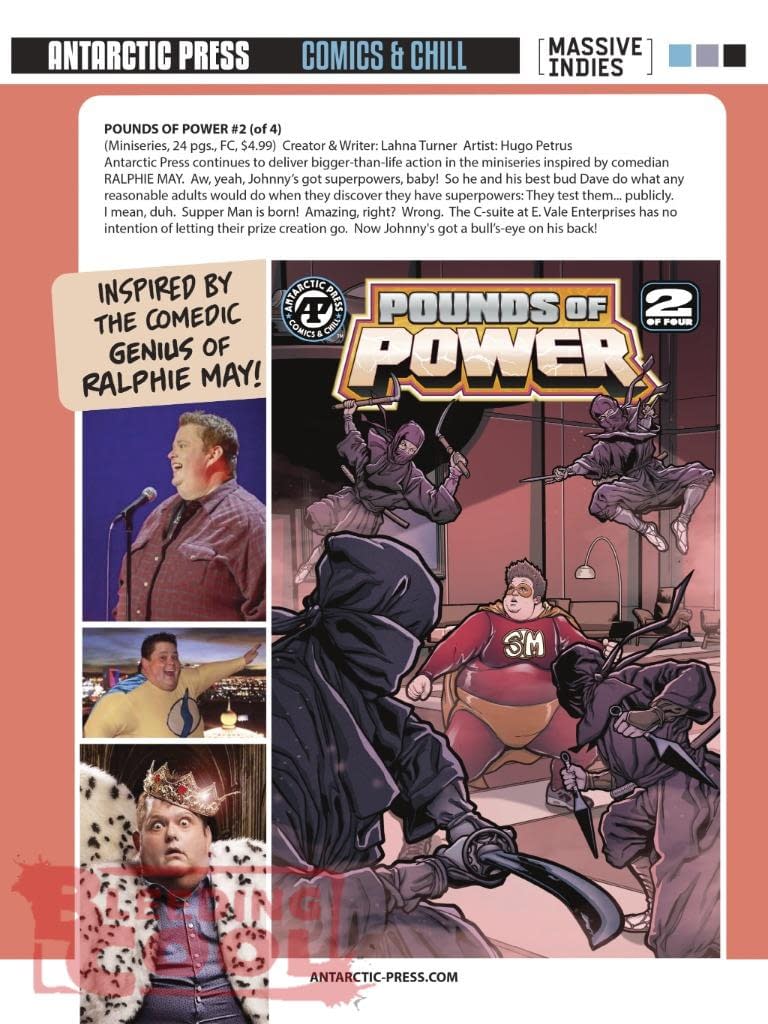 Antarctic Press continues to deliver bigger/than/life action in the miniseries inspired by comedian RALPHIE MAY. Aw, yeah, Johnny's got superpowers, baby! So he and his best bud Dave do what any reasonable adults would do when they discover they have superpowers: They test them… publicly. I mean, duh. Supper Man is born! Amazing, right? Wrong. The C/suite at E. Vale Enterprises has no intention of letting their prize creation go. Now Johnny's got a bull's/eye on his back!