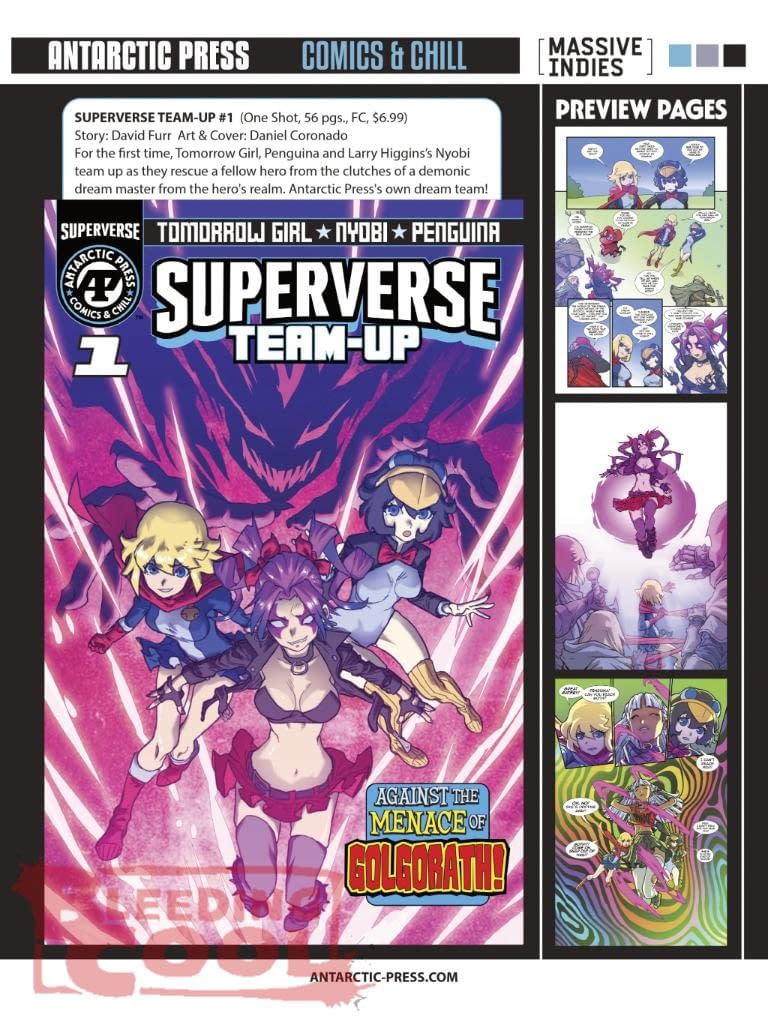 Ben Dunn has been teasing a possible new distribution agreement for Antarctic Press to be announced soon. Have they switched from the Massive Indies subdistribution through Lunar Distribution to another subdistributor within the catalogue, such as Rocketship or Prana? Have they moved directly to be distributed by Lujnaer Distribution? Or have they switched entirely to Penguin Random House? We will find soon I am sure, but for their May 2026 solicits through Massive/Lunar, they are launching the Superverse Team-Up from David Furr and Daniel Coronado, and The Cryptd Corps by Anthony Cleveland and Max Bertolini…