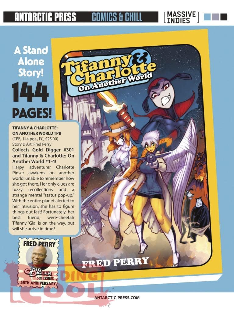 Collects Gold Digger #301 & Tifanny and Charlotte On Another World #1/4! Harpy adventurer Charlotte Pinser awakens on another world, unable to remember how she got there. Her only clues are fuzzy recollections and a strange mental "status pop/up." With the entire planet alerted to her intrusion, she has to figure things out fast! Fortunately, her best friend, were/cheetah Tifanny 'Gia is on the way, but will she arrive in time? $25 5/20/2026