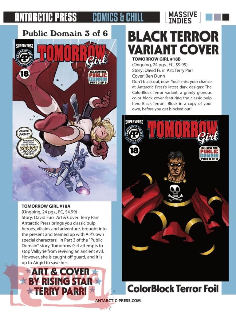 Antarctic Press brings you classic pulp heroes, villains and adventure, brought into the present and teamed up with A.P.'s own special characters! In Part 3 of the "Public Domain" story, Tomorrow GIrl attempts to stop Valkyrie from reviving an ancient evil. However, she is caught off guard, and it is up to Airgirl to save her.