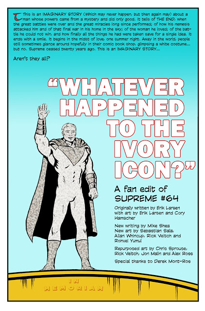 Bit Mike Shea was never happy with that. And, using the artwork, unpublished scripts by Moore, and a bunch of volunteer artists, he has created what he sees a proper ending to Moore's Supreme run. And he has published this unauthorised sequel – or finale – to Supreme, online.