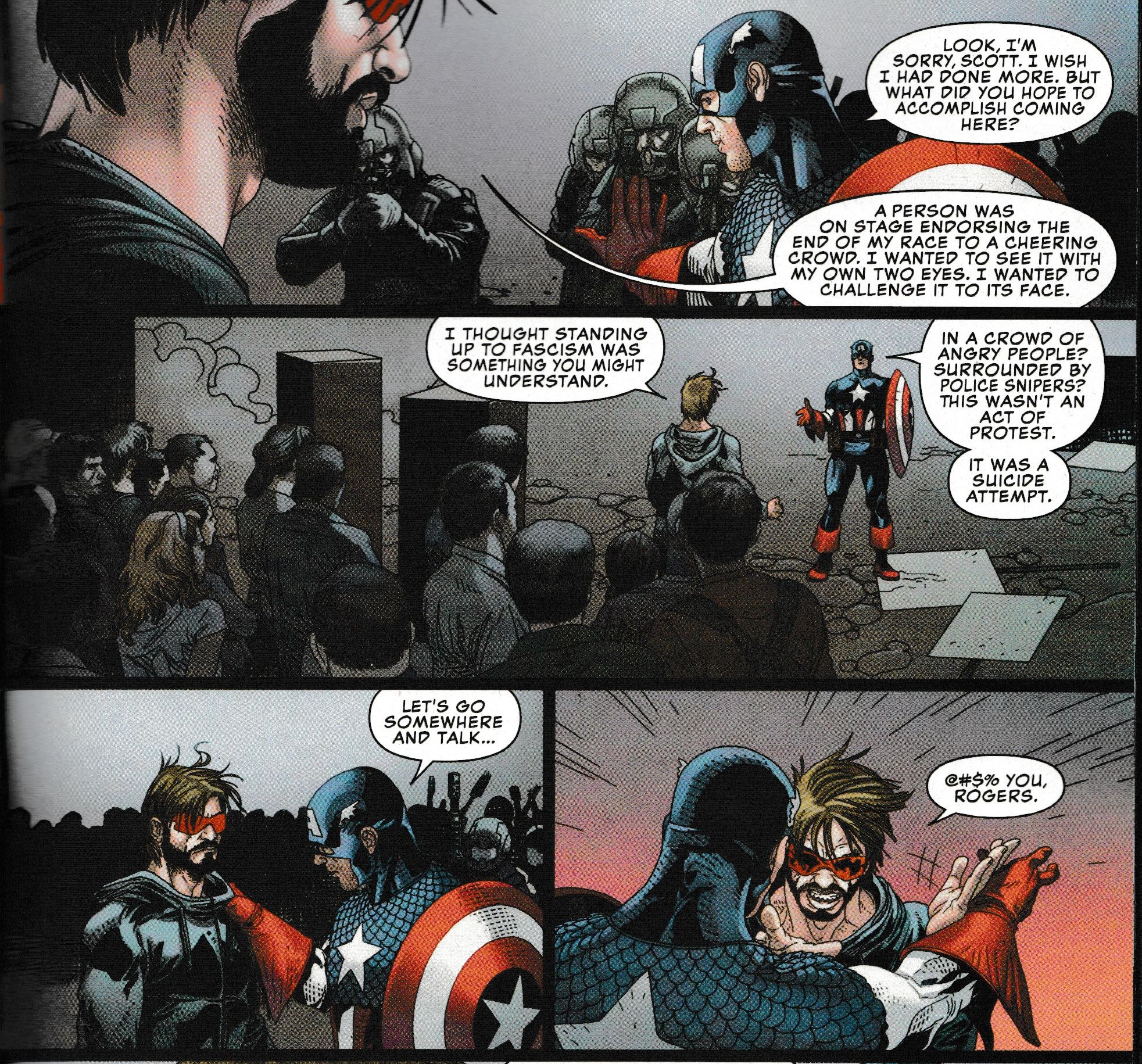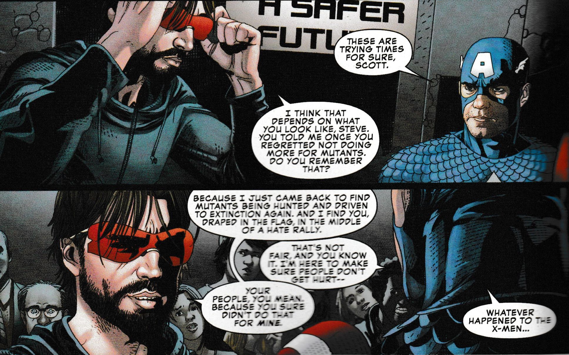 Anyway, the Chamber confrontation clearly inspired something in Cyclops in his confrontation with Captain America at a Human Rights rally…
