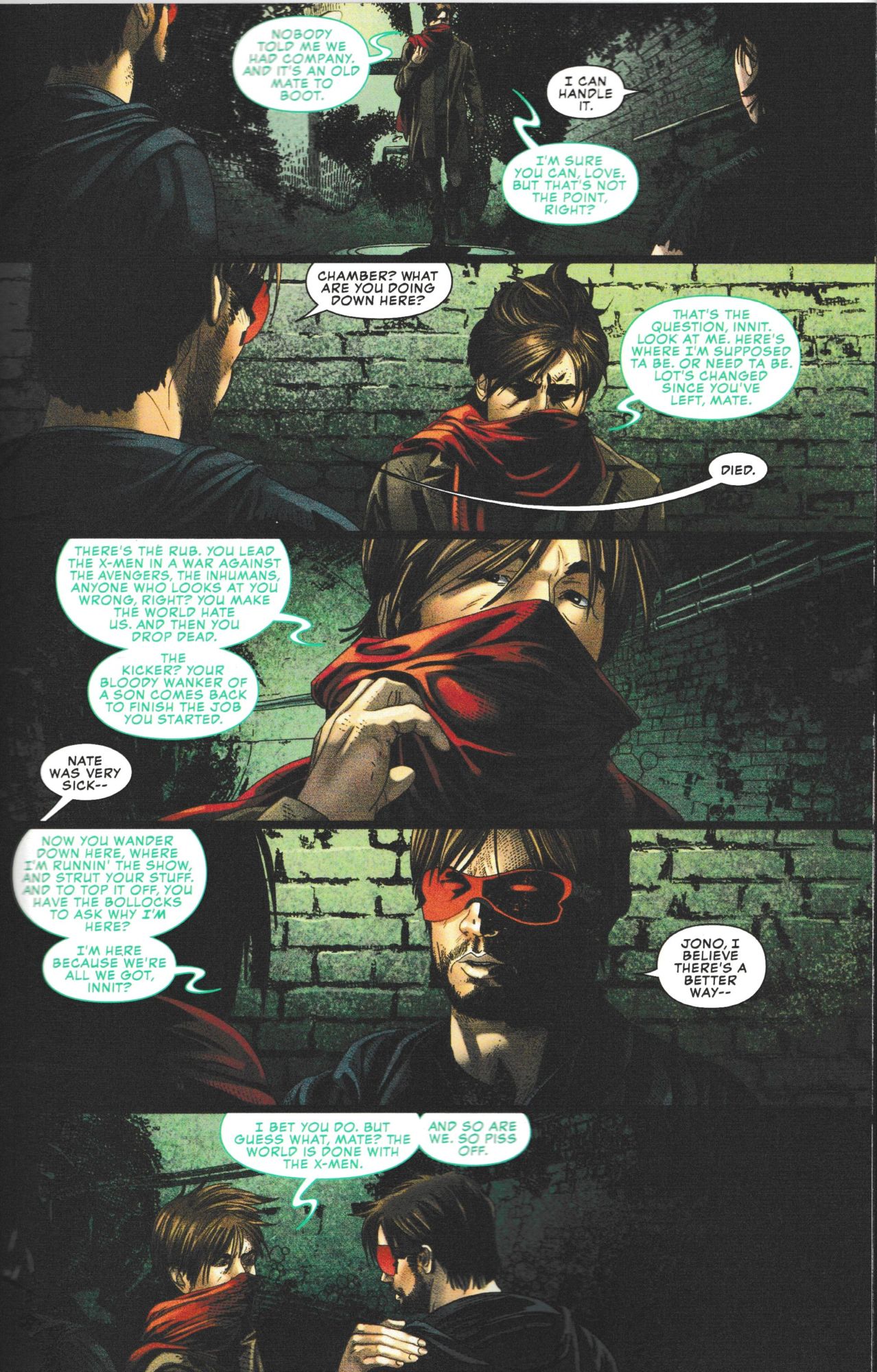 Three uses of the word 'mate', one 'love' as an affectionate pronoun, one 'bollocks', one 'wanker', two 'innit', spelling 'to' as 'ta', and two uses of the word 'piss' without meaning urine or being annoyed. You know, Psylocke never gets this treatment. Though Asgardians Of The Galaxy also surprised me today.