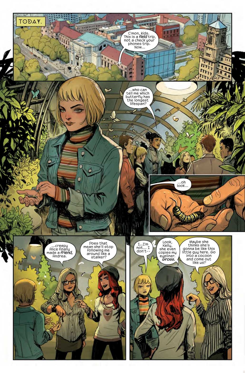In this preview of next week's Meet the Skrulls #1, we see Alice, a Skrull masquerading as a human high school student, bullied by mean girls on a school field trip.