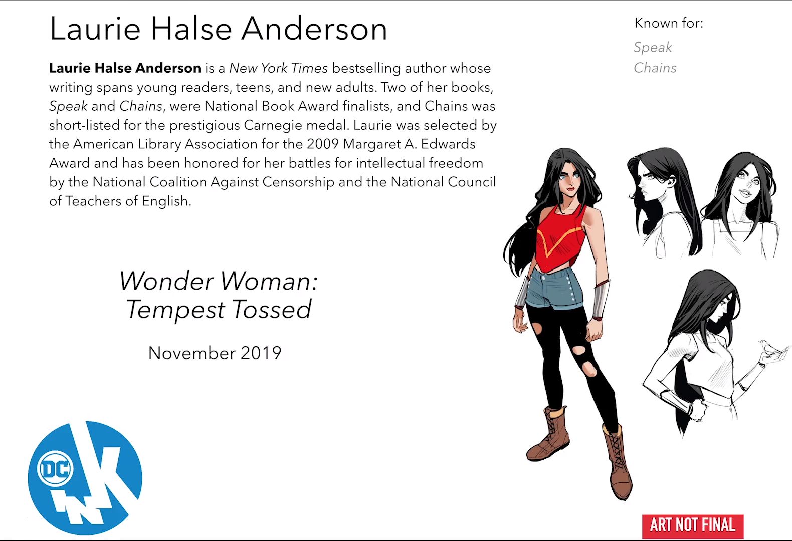 At the American Library Association meet for the launch of the DC Ink and DC Zoom line for younger readers, for the Young Adult Zoom line, DC announced Wonder Woman: Tempest Tossed by the Speak and Chains writer Laurie Halse Anderson.
