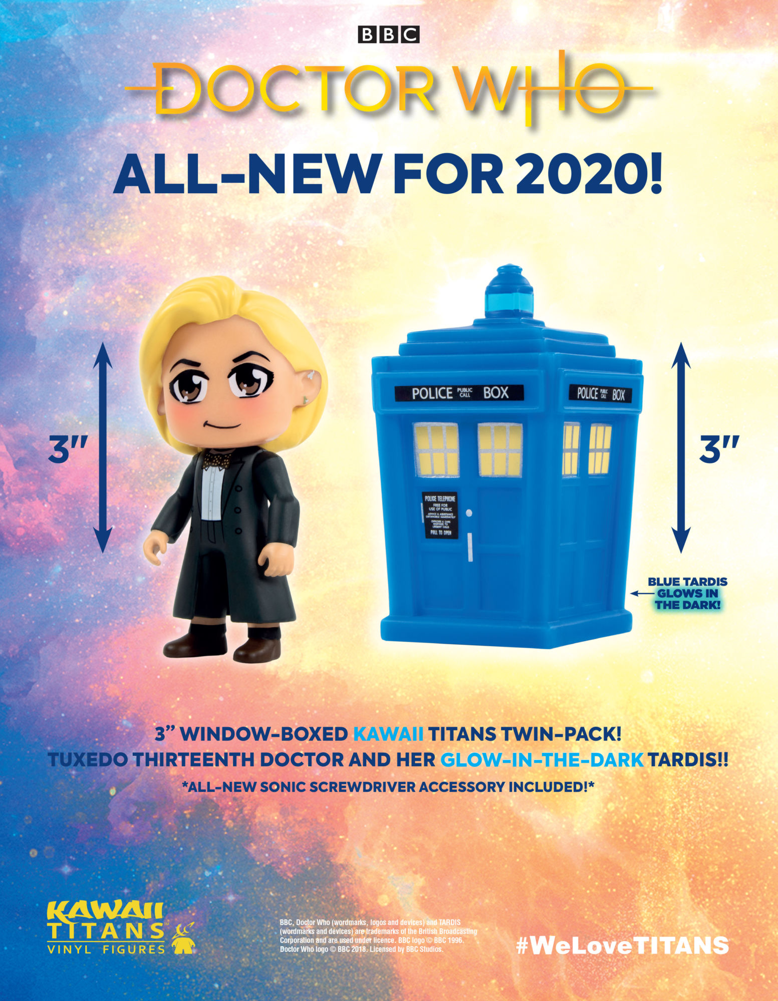 An all-new 3" Thirteenth Doctor Kawaii TITAN, dressed in the tuxedo she wore in Spyfall (episode one of season twelve) is time-travelling her way to you for March 2020, alongside an updated 3" Blue Glow-In-The-Dark TARDIS TITAN!
