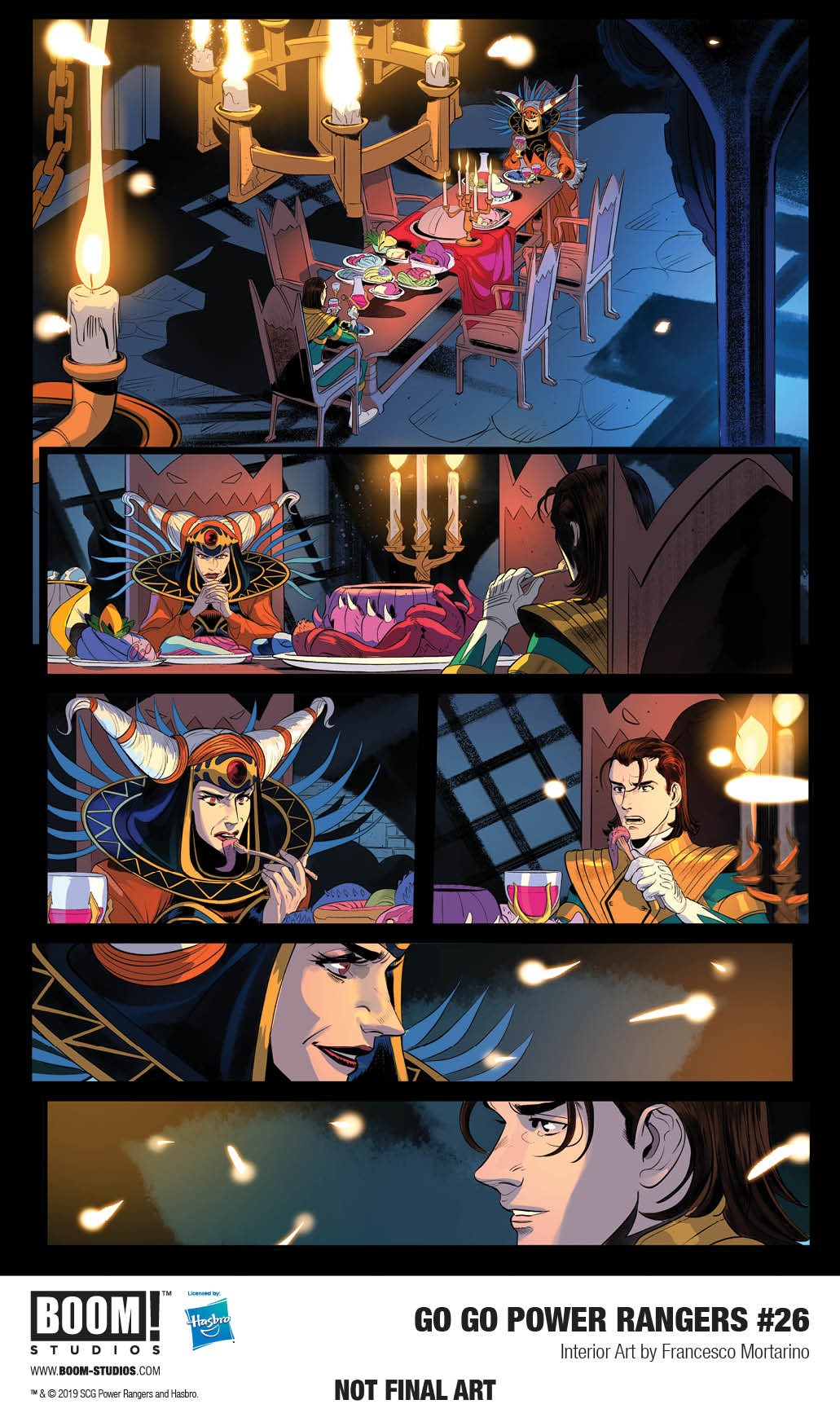 Thanksgiving is comic up, and it's a time to set aside differences and sit down with loved ones for a nice dinner where you promptly remember those differences and fight about it for hours. It's a tradition that Rita Repulsa and Tommy Oliver honor in this first look preview at explosive publisher BOOM! Studios' Saban's Go Go Power Rangers #26, by Ryan Parrott, Sina Grace, and Francesco Mortarino.