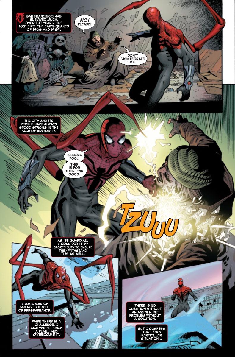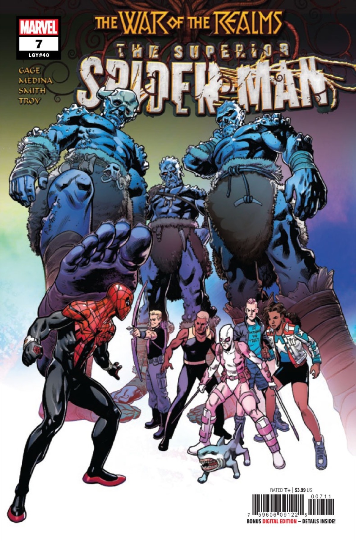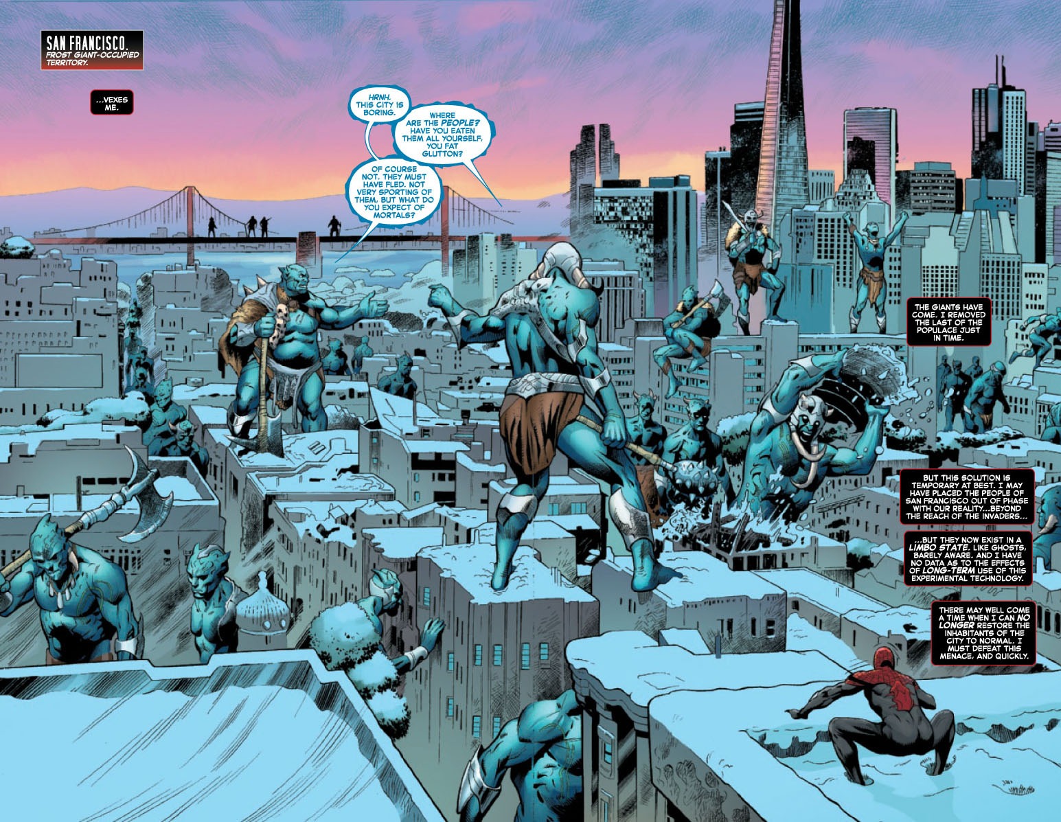 Superior Spider-Man #7 hits stores next Wednesday, tying in with the War of the Realms super-mega-crossover event. In the story, Superior Spider-Man is defending San Francisco against the invasion, having successfully evacuated the citizens… well, the regular ones, at least. The Google employes presumably got to escape on private busses. Now, it's up to Doc Ock to take on the Frost Giants all by himself!