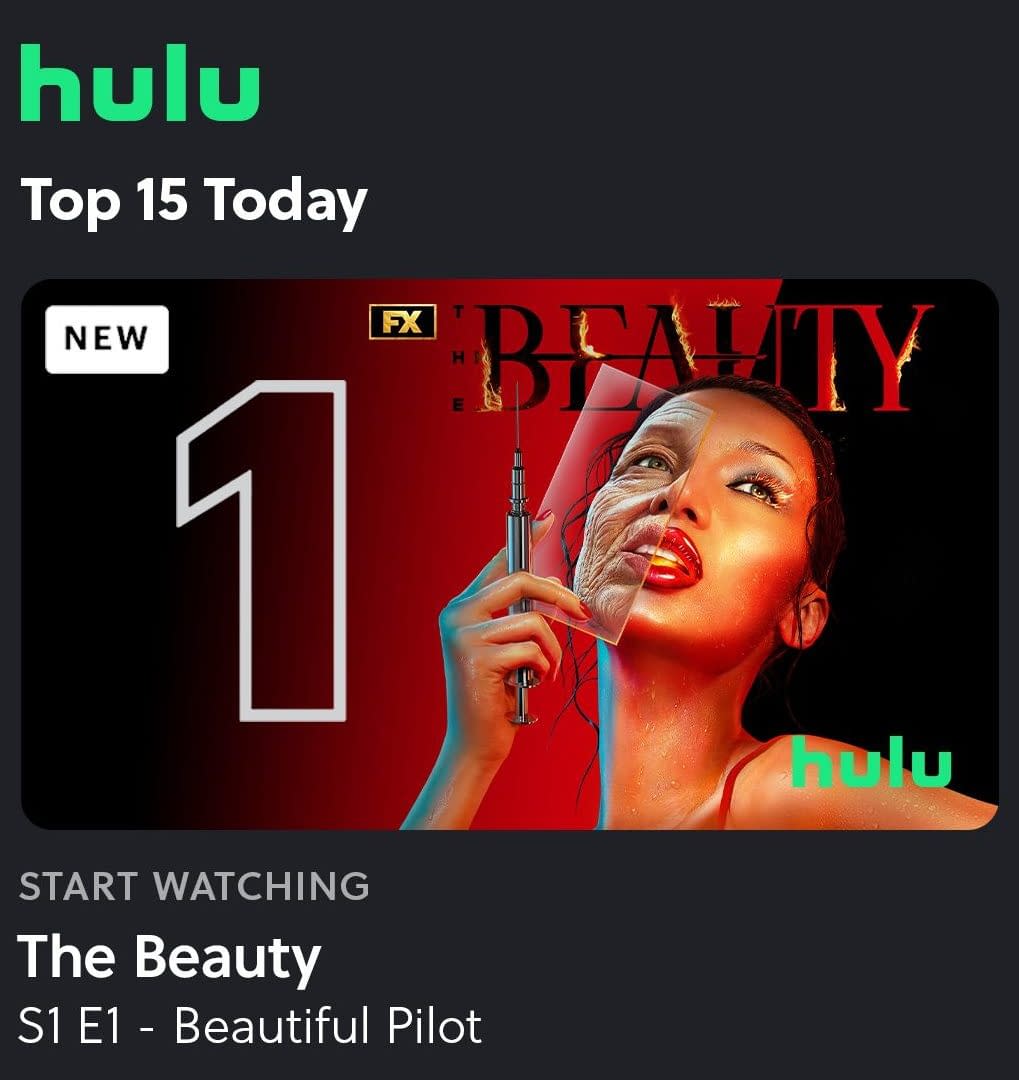 The Ryan Murphy adaptation of Jeremy Haun and Jason A. Hurley's comic book The Beauty debuted three episodes last week on FX and Hulu in the US and Disney+ everywhere else. After the brutal reviews of Murphy's recent legal drama, All's Fair, The Beauty seemed to go over a little better for the showrunner with an 74% positive critic rating on Rotten Tomatoes. And while official numbers are yet to be released, The Beauty hit the #1 spot on Hulu's Top 15 before week's end, and had the #1 viewed trailer in FX history.