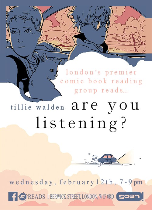 - Reads February: Are You Listening? by Tillie Walden, monthly reading group explores Are You Listening?, the latest book from Tille Walden, an intimate and emotionally soaring story about friendship, grief, and healing. Gosh Comics, Berwick Street, London from 7-9pm.