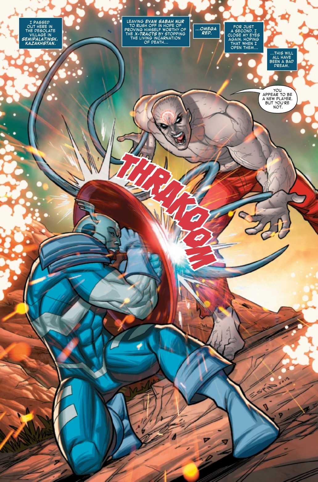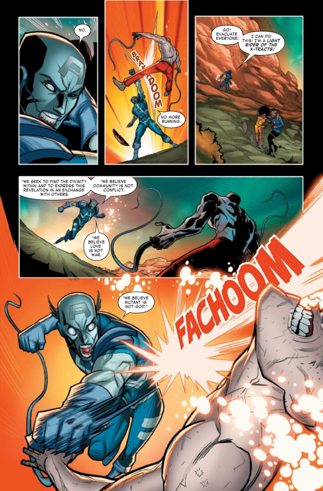 Geeze, one shot and he cracks a Captain America shield? They don't make those things like they used to, do they? Or perhaps, the shield is a metaphor for the Age of X-Man itself, which is surely beginning to shatter. The only question is, who will survive to go through the Hickboot?