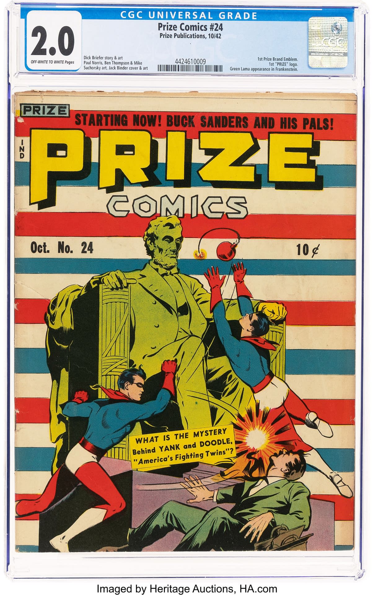 The Comics Magazine Association of America adopted its Code on October 26, 1954, and Frankenstein ended with #33 cover-dated October-November 1954. But the character's run by Briefer in Prize Comics is absolutely incredible, and there's a Prize Comics #24 (Prize, 1942) CGC GD 2.0 Off-white to white pages copy up for auction in the 2025 October 16 Golden Age Comics Century Showcase Auction III at Heritage Auctions.