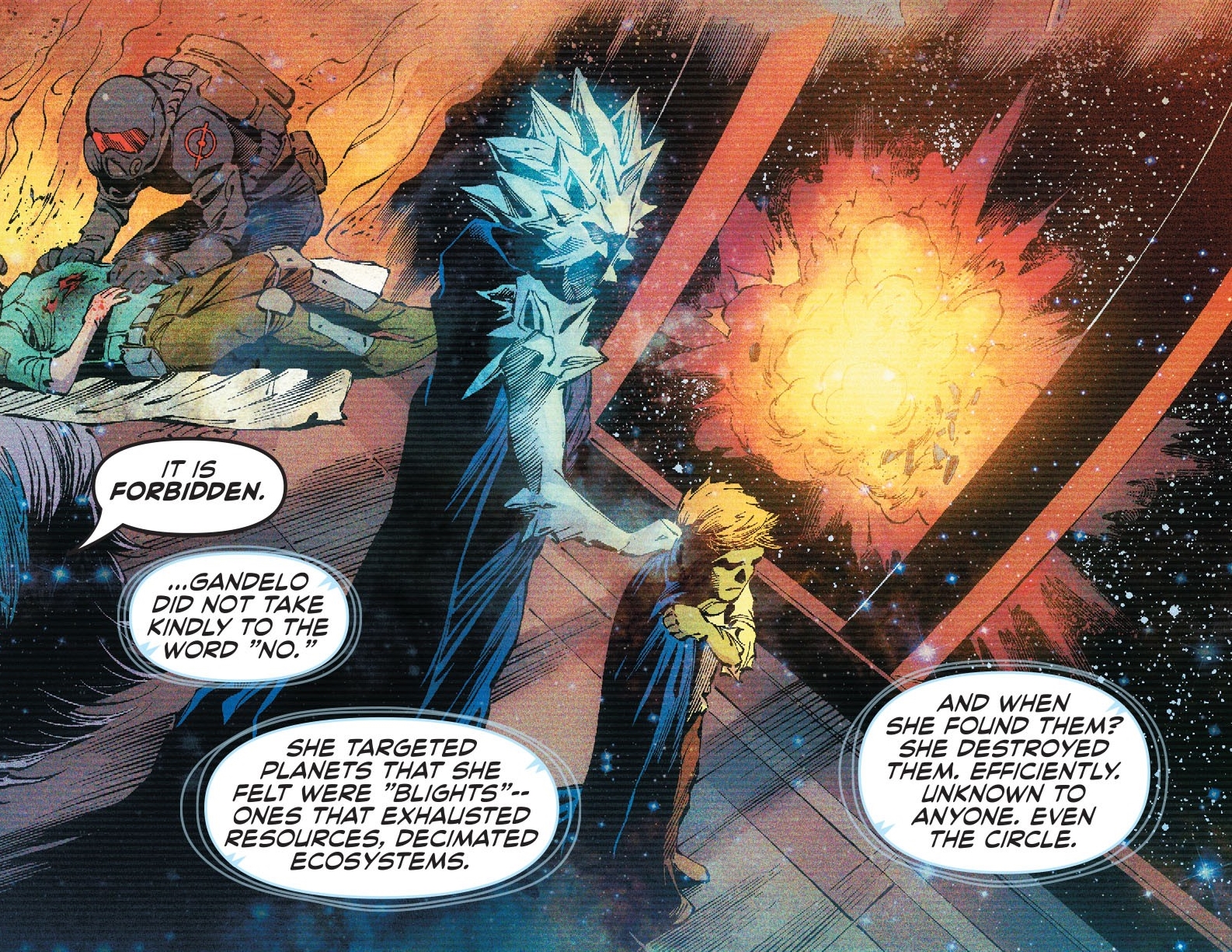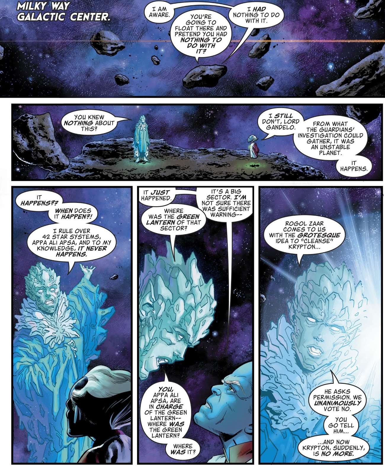 After the destruction, Gandelo voiced concerns and demands answers of Appa Ali Apsa of the Guardians of the Universe and demands answers. How could this happen? Where was the Green Lantern Corps to protect these people?