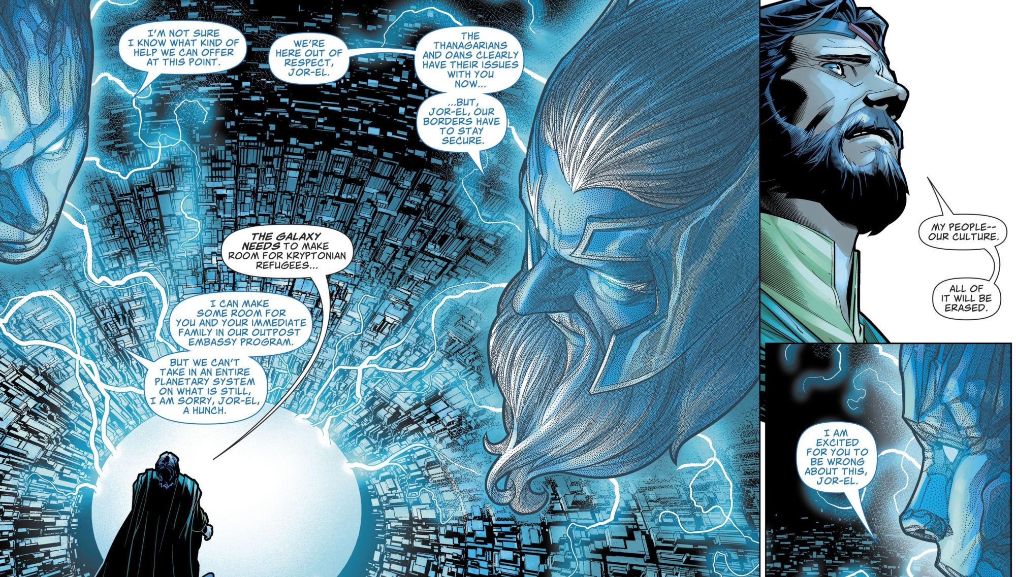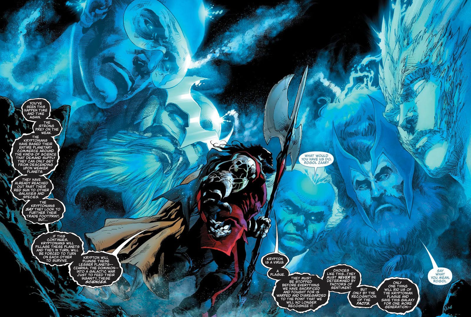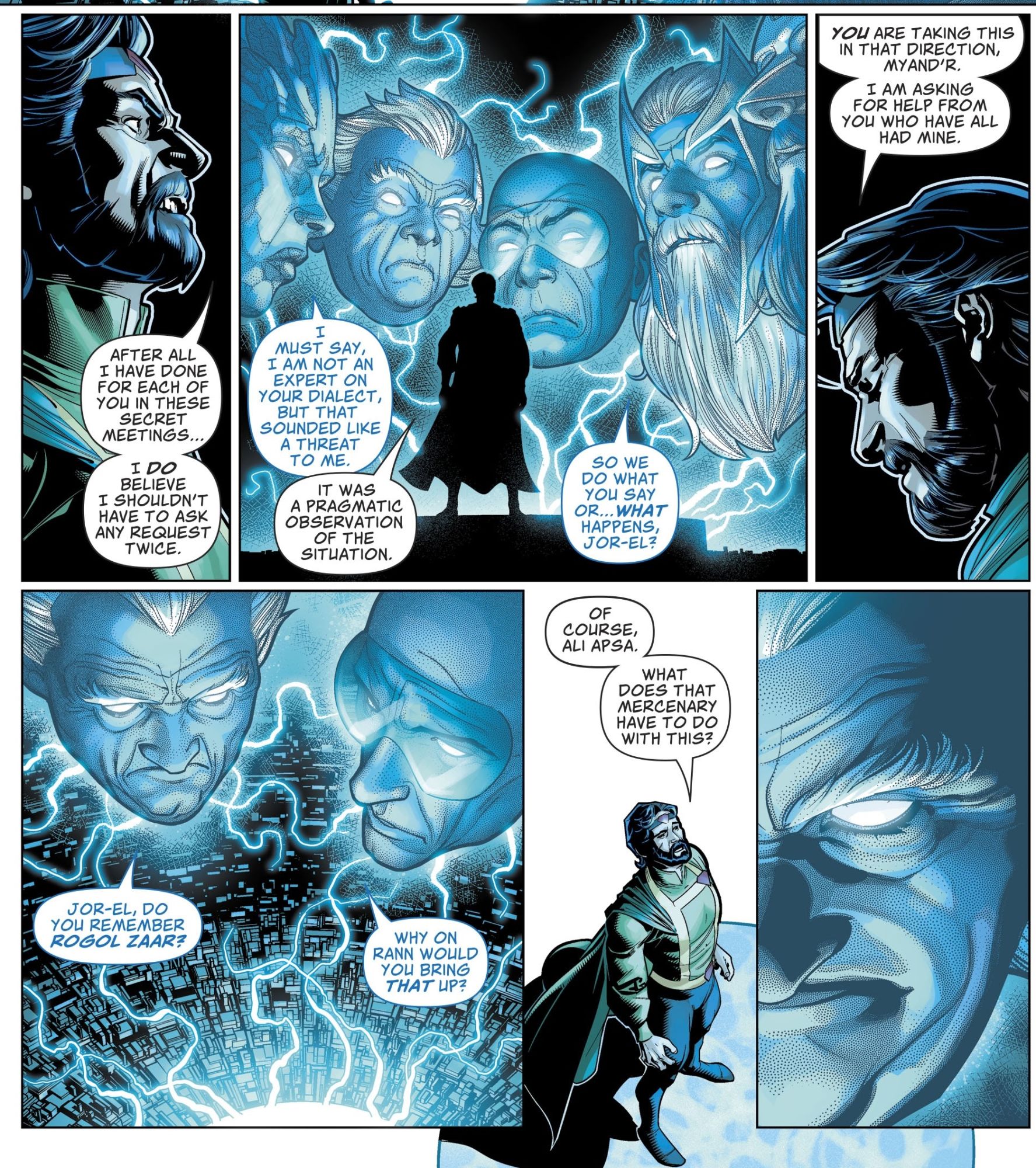 We've seen The Circle a number of times before, In Man Of Steel #1, they were the group of alien leaders, led by Guardian Appa Ali Apsa, Sardath of Rann, Thangarian Defense Minister, King Myand'r of Tamaran, and Empress Gandelo who work together to decide the fate of their galaxy, that Rogol Zaar appealed to, to destroy Krypton, though they denied his request. The intimation that he did it anyway.