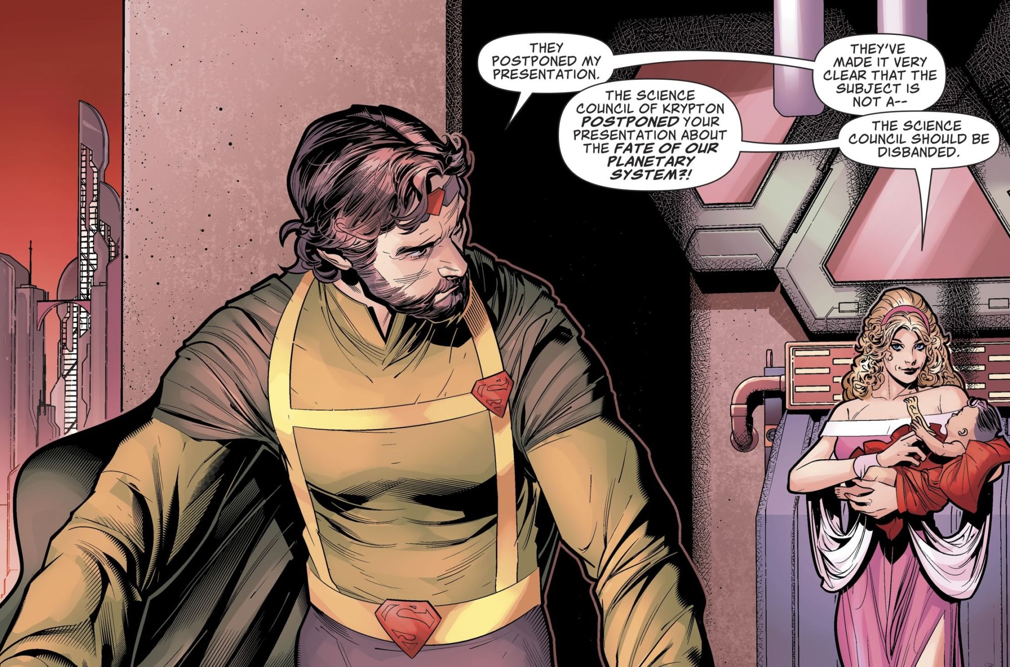 In today's Superman #13, we get to revisit those days. With Brandon Peterson drawing up a storm on this comic book. Jor-El, Lara and baby Kal-El, with the blame for inaction solely on the Science Council of Krypton…