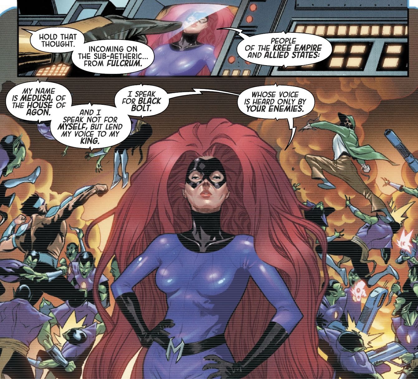 But this spin-off book goes beyond the last issue of Imperial, with The Inhumans making their address to the galaxy. Or at least Medusa is.