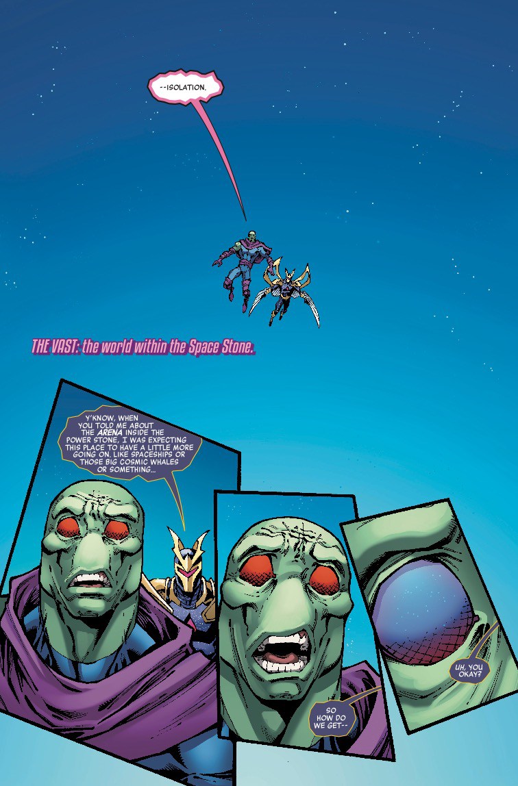 Next week's penultimate issue of Infinity Wars: Sleepwalker sees "Dark Starhawk" Christopher Powell being interrogated inside the Soul Gem. After attempting to recap his own origin story, but being asked to cut to the chase, Powell tries to explain why Sleepwalker is on the side of the angels. This leads to a scene that's eerily reminiscent of one from a rival publisher…