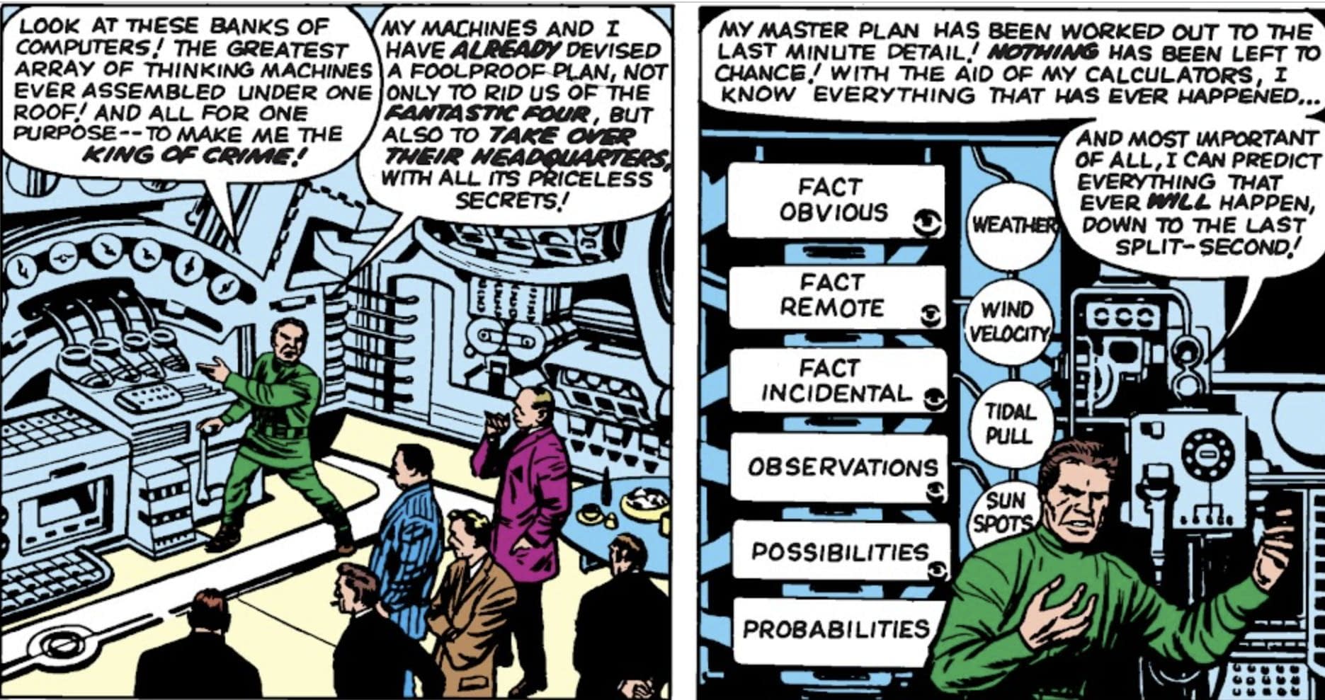 The Mad Thinker was introduced by Jack Kirby and Stan Lee in Fantastic Four #15 in 1963 as a scientist with the ability to predict future events precisely, but without an origin or secret identity.