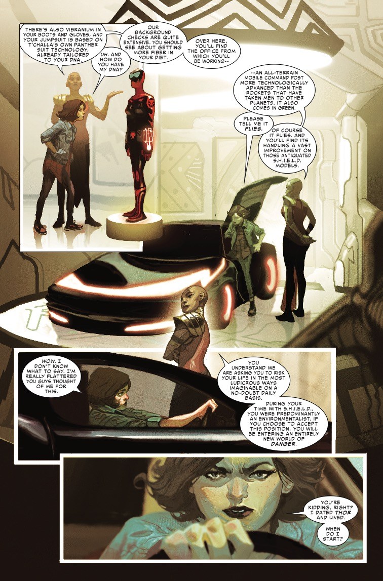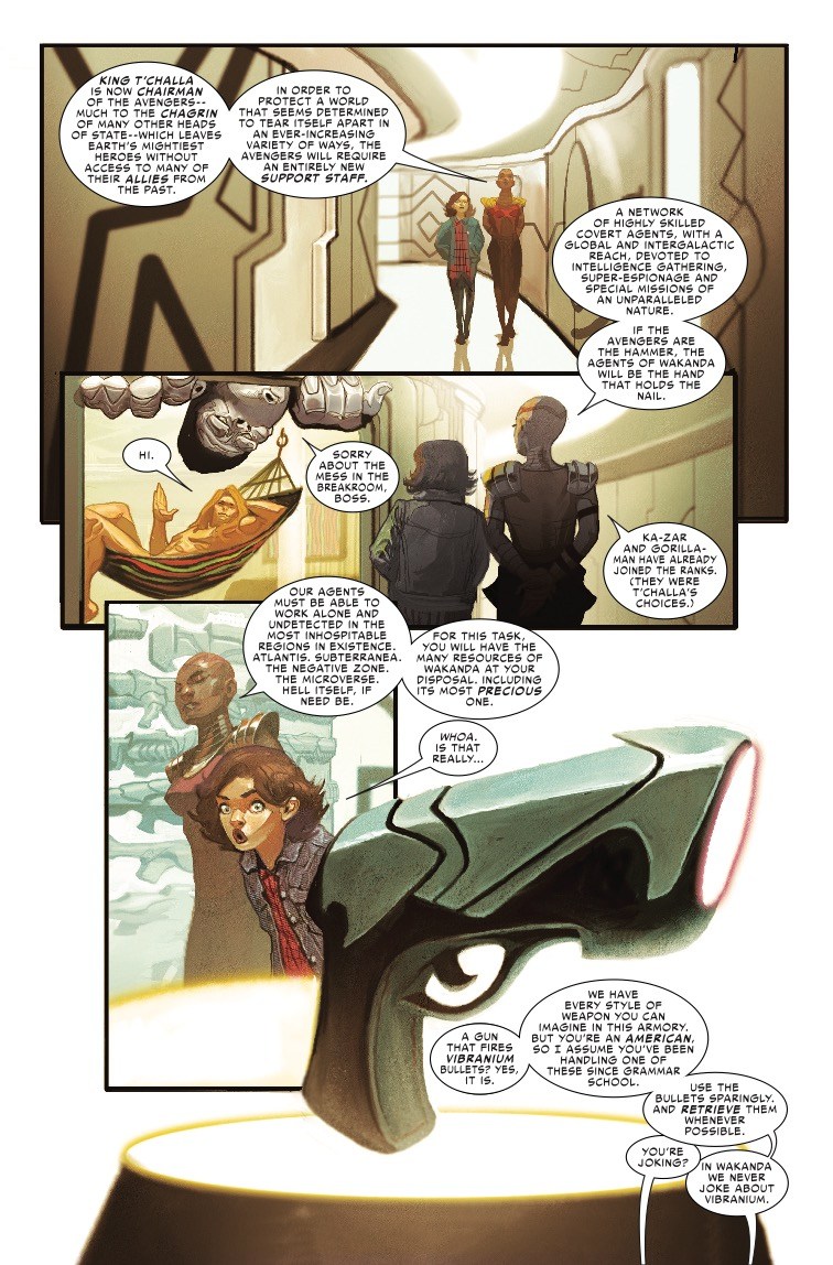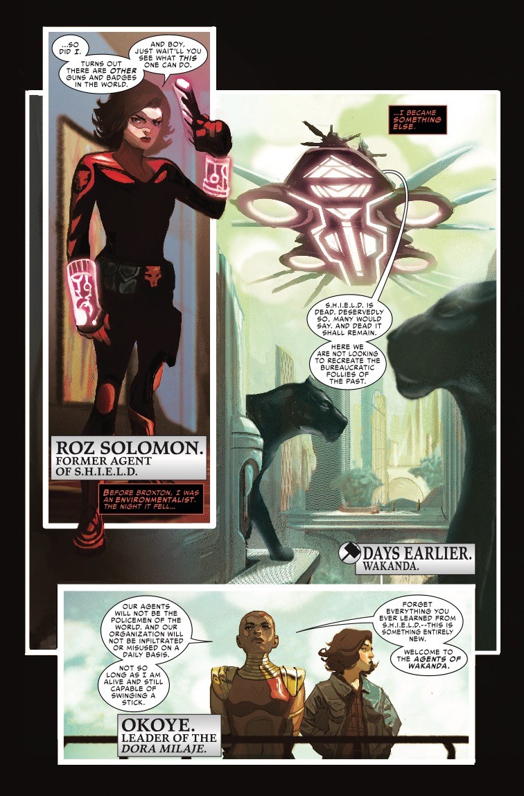 But the Panther has a solution, and he's sent Okoye to gather his own Agents of Wakanda to pick up the slack. One of the new recruits is former SHIELD agent and former girlfriend of Thor, Roz Solomon. But to get an American law enforcement officer on the squad, Okoye is going to need to resort to purely American measures…