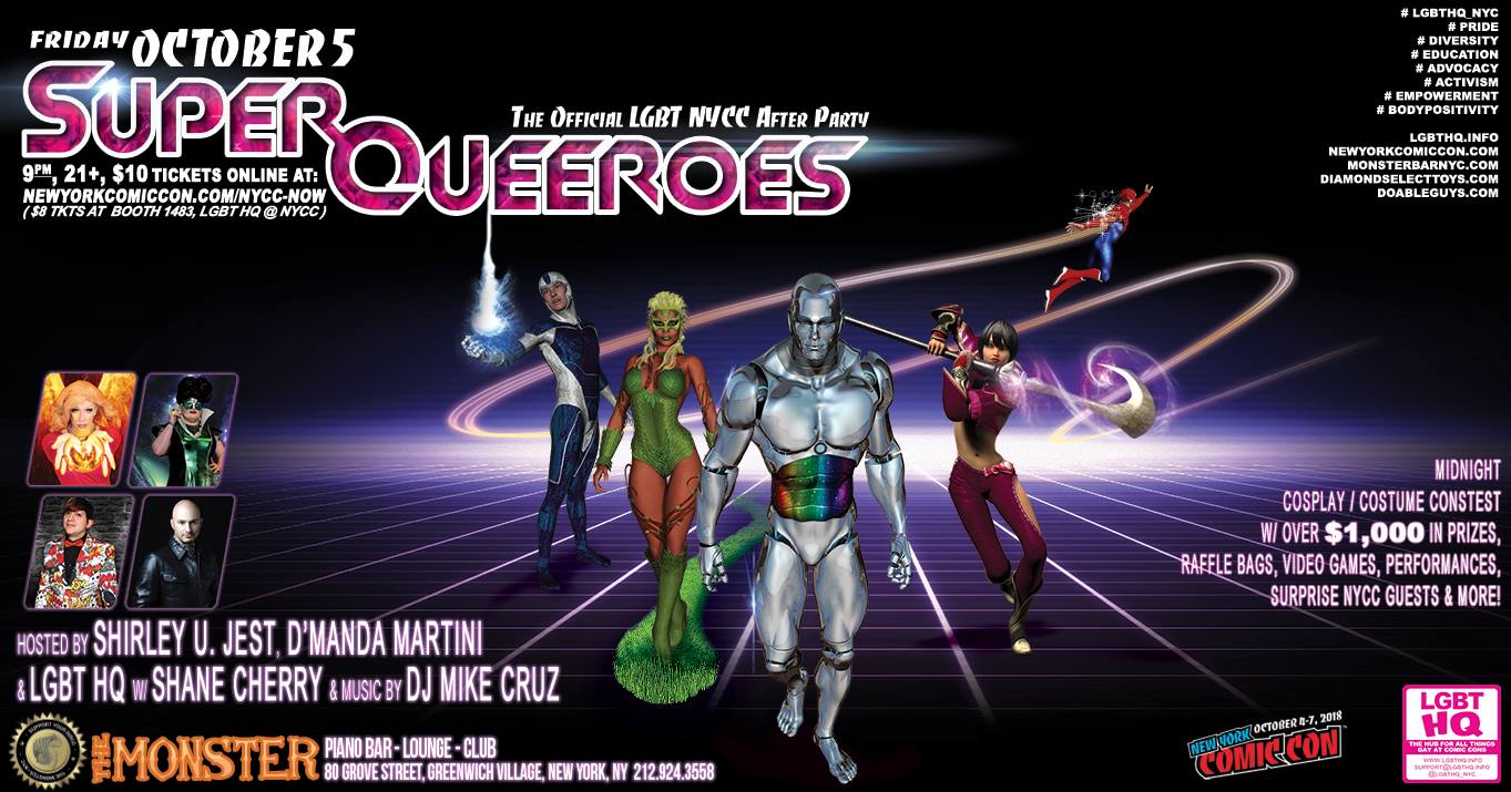 Super Queereos: NYCC 2018 LGBTQ AFTER PARTY, The Manhattan Monster Bar, 80 Grove Street, 9pm-late, $10 online, $8 from LGBT HQ booth, #1483 at the show. Featuring DJ Mike Cruz, hosts Shirley U. Jest and Matthew Levine of LGBT HQ. Special guests D'Manda Martini, Captain Green Lantern 2018 and Shane Cherry. The night will feature drag and burlesque performances, A Cosplay Contest with over $1,000 in prizes, Video Games, Raffle Bags, Suprise Convention Guests & more.
