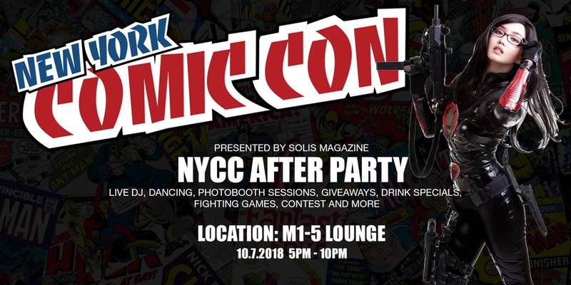 Solis Magazine After Party 2018, M1 Lounge, 52 Walker Street, 5pm –10pm. Solis Magazine presents a Special after party for everyone who attended NYCC 2018, Come dressed as your favorite character and prepare to have a lot of fun. Stay tuned for guest & sponsor info, plus our (cosplay & dance party) announcements. $10 in advance, $15 cash only at the door. Special VIP Seating Available – Limited Seating First come, first serve Basis. Live DJ, dancing, Photobooth Sessions, giveaways, Drink Specials, fighting games, Contest and more. 21+.
