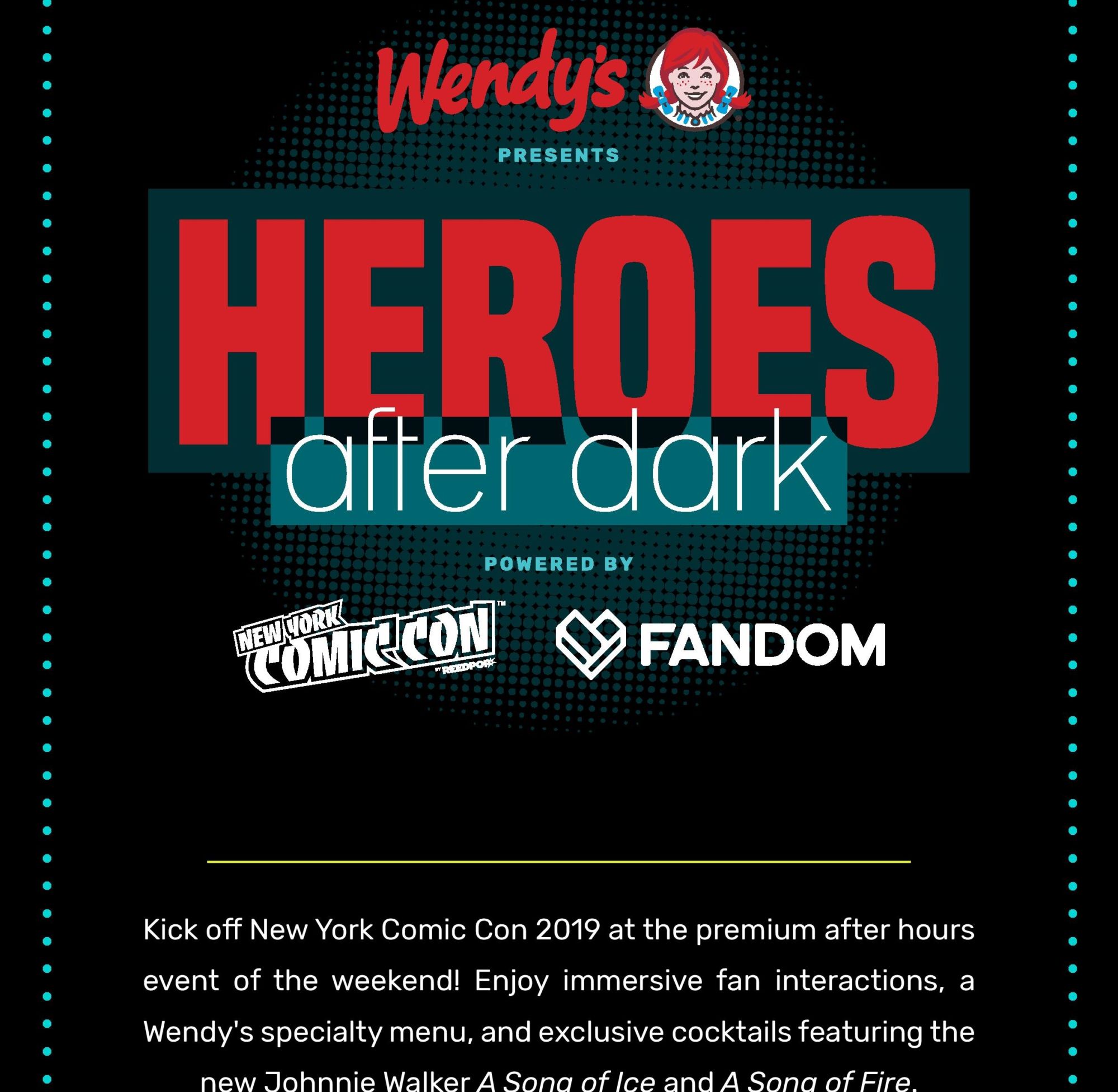 Wendy's Presents 'Heroes After Dark'. A featured DJ set by Chromeo, and music by DJ Elliot. Enjoy immersive fan interactions, a Wendy's specialty menu, and exclusive cocktails featuring the new Johnnie Walker A Song of Ice and A Song of Fire limited edition whiskies. The event will also benefit charity partner, the Cystic Fibrosis Foundation. Sony Hall, 235 W. 46th Street. 8pm-midnight. RSVP.