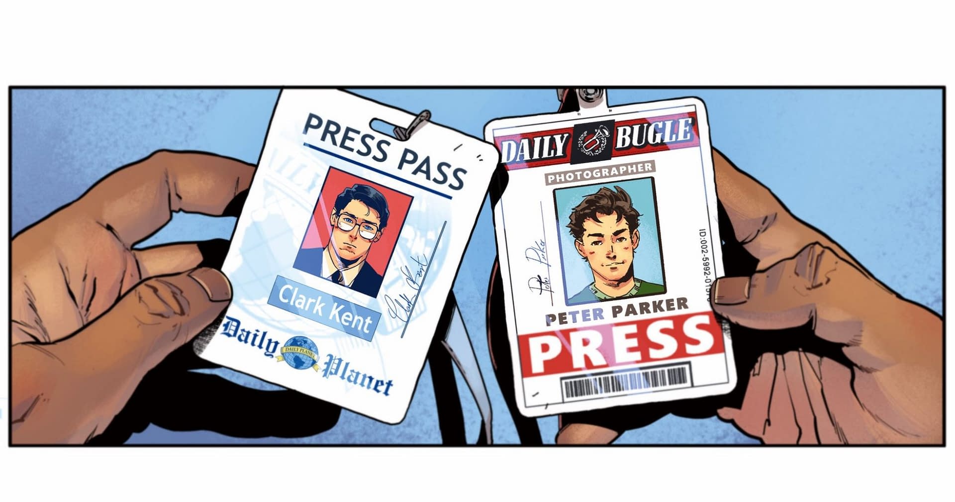 The Press Passes of Clark Kent and Peter Parker in Mark Waid and Jorge Jiménez's Superman/Spider-Man