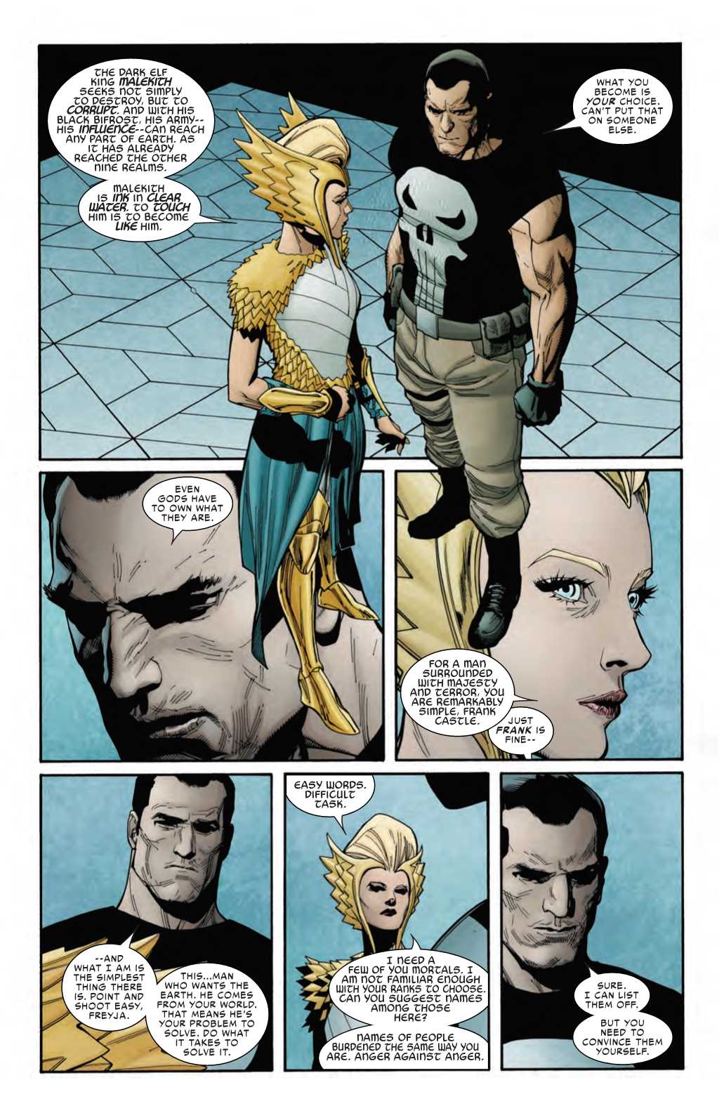 The Punisher isn't generally known for his skills as a philosopher or a poet. He's more well-known for his skills with bullets and murder. But nevertheless, Frank Castle waxes philosophical in this preview of War of the Realms: Strikeforce: Dark Elf Realm #1. Frank is having a conversation with Freya after being recommended by Captain America for an important role in the War of the Realms…