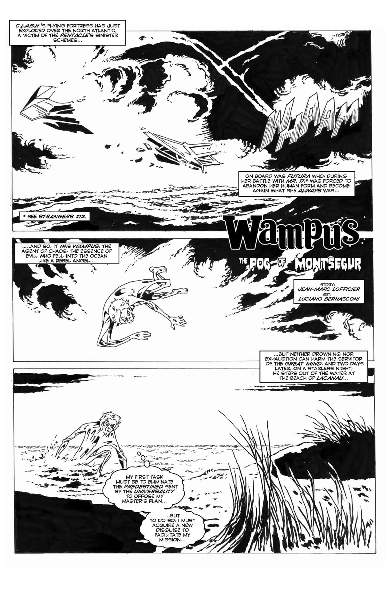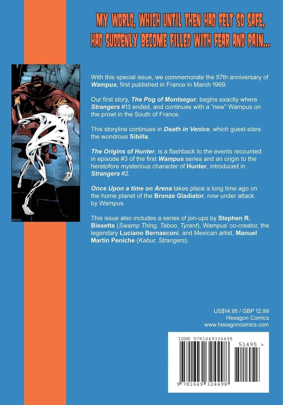 Our first story, The Pog of Montsegur, begins exactly where Strangers #13 ends, and continues with a "new" Wampus on the prowl in the South of France. This storyline continues in Death in Venice, which guest-stars the wondrous Sibilla. Hunter ! is a flashback to the events recounted in episode #3 of the original Wampus series and an origin to the heretofore mysterious character of Hunter, introduced in Strangers #2. Once Upon a time on Arena takes place a long time ago on the home planet of the Bronze Gladiator, now under attack by Wampus.