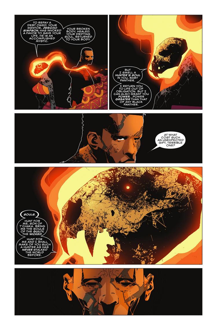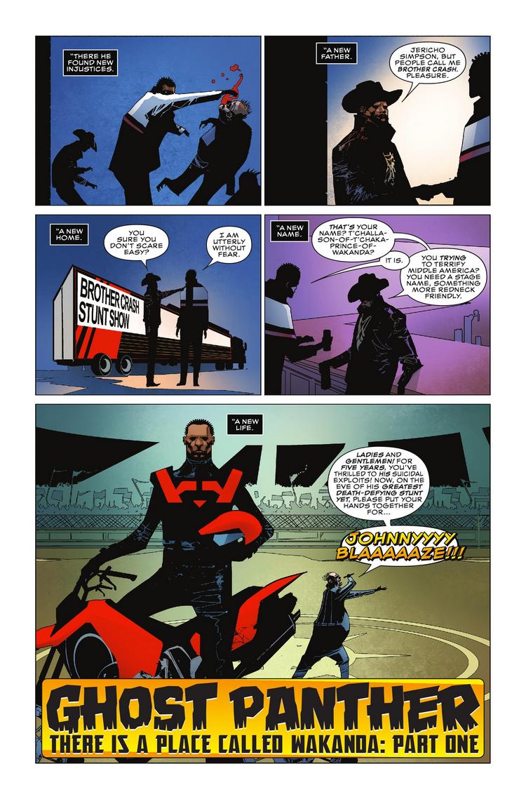 Ah, Infinity Warps. It's a concept so dumb, Marvel almost had no choice but to turn it into a mini-event inside a super-mega-crossover event. The latest Infinity Warp to get a solo book is Ghost Panther, a mashup of Black Panther and Ghost Rider. And a preview of next week's Ghost Panther #1 explains this amalgamation's origins. Playing a role in those origins is the perceived xenophobia of "Middle America," as explained by Jericho Simpson, himself an amalgam of Crash Simpson (?) and Brother Voodoo known as Brother Crash. And it's Brother Crash who advises the Panther that he needs to change his name from T'Challa-Son-Of-T'Chaka-Prince-of-Wakanda to something that won't "terrify Middle America."
