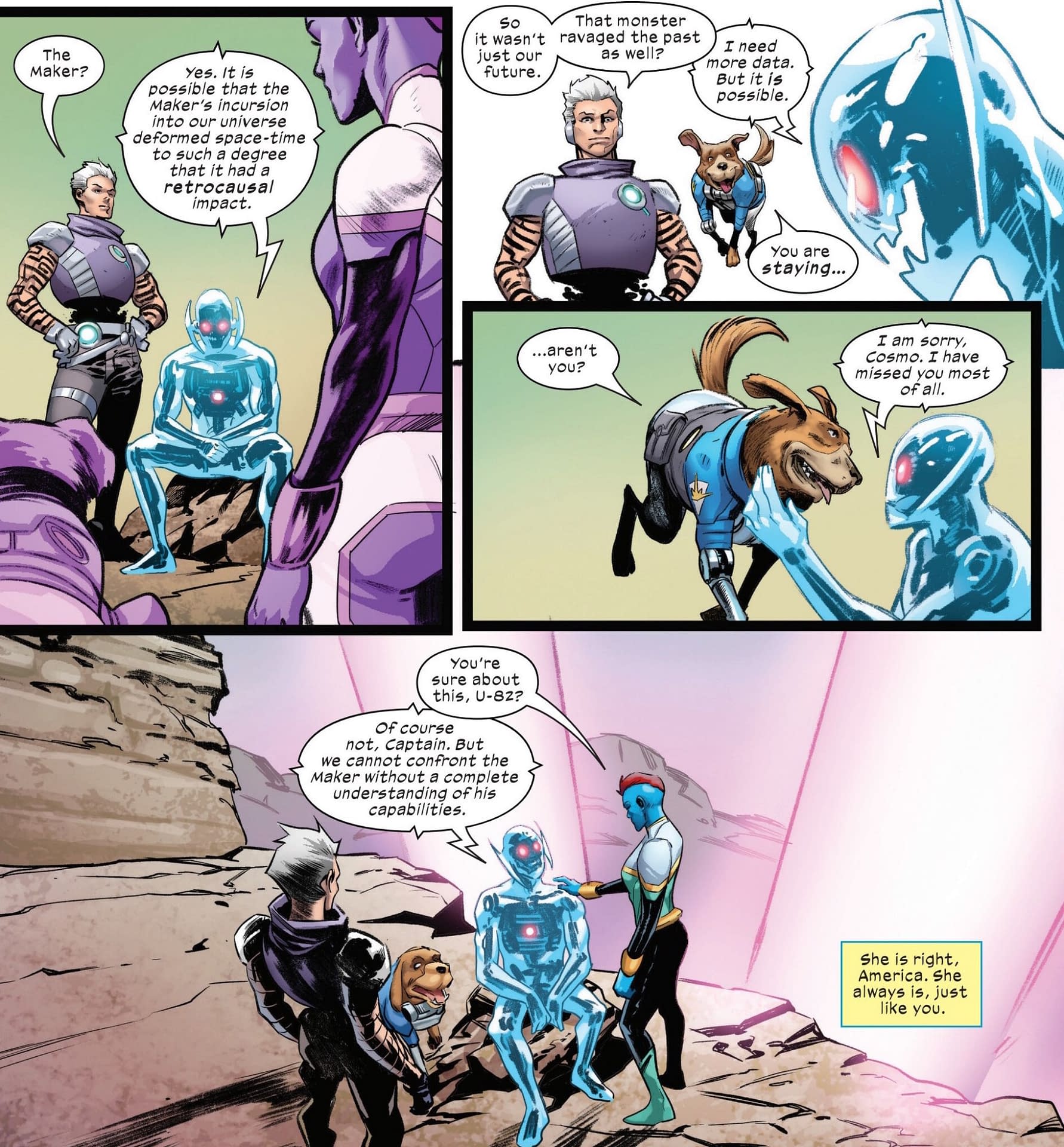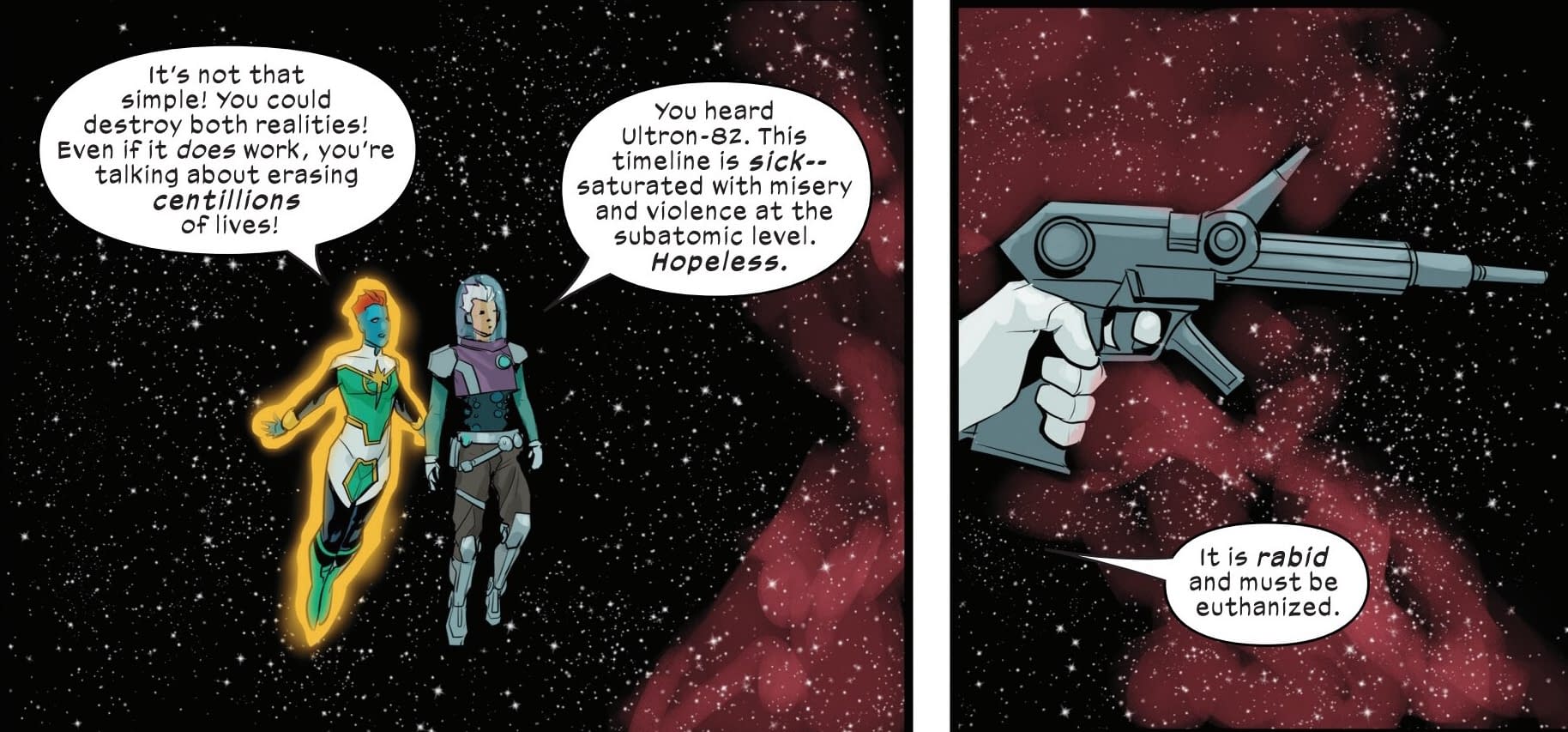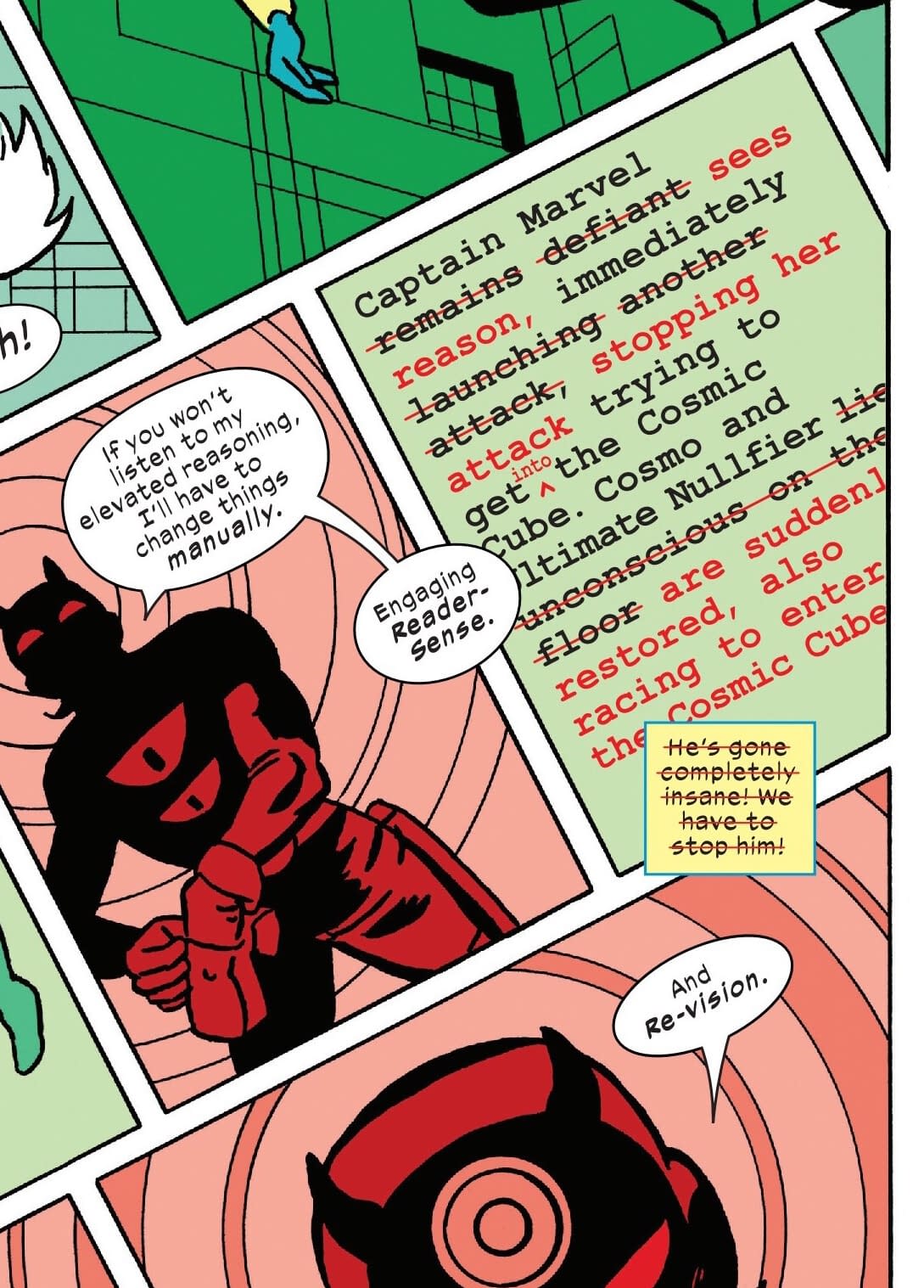 … or rewriting the script on the fly. He doesn't even need Grant Morrison's typewriter to do it. While U-82, an Ultron looking more like the Machine Man of Earth X and playing the role of The Watcher is looking into the ultimate truth of this Ultimate Universe…