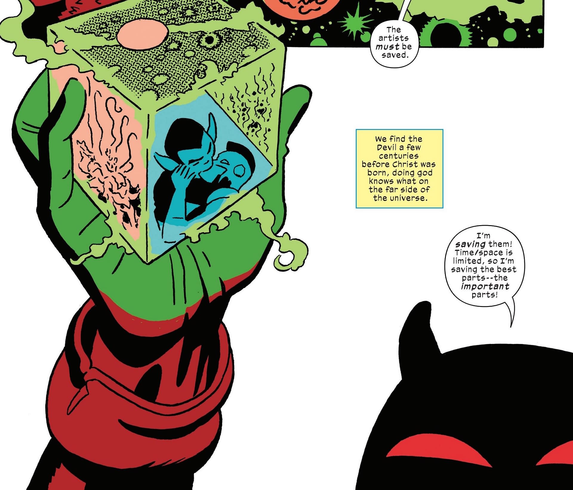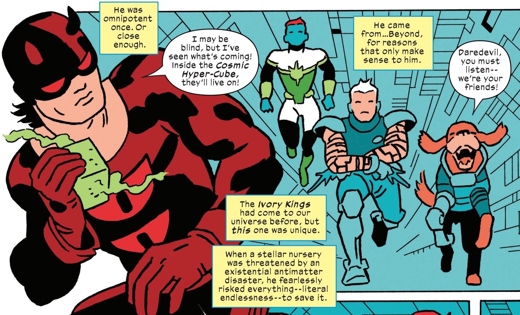 It's not Matt Murdoch. But in another universe, he met Matt Murdoch. In today's Ultimate Universe: Two Years In #1 by Deniz Camp, Alex Paknadel, Francesco Manna, Javier Pulido, Lee Ferguson, Patrick Boutin-Gagne, Phil Noto we meet the Ultimate Daredevil, one of the Ultimate Guardians Of The Galaxy, messing around with a Cosmic Cube, and reuniting the Absolute Martian Manhunter team within the Ultimate Universe.