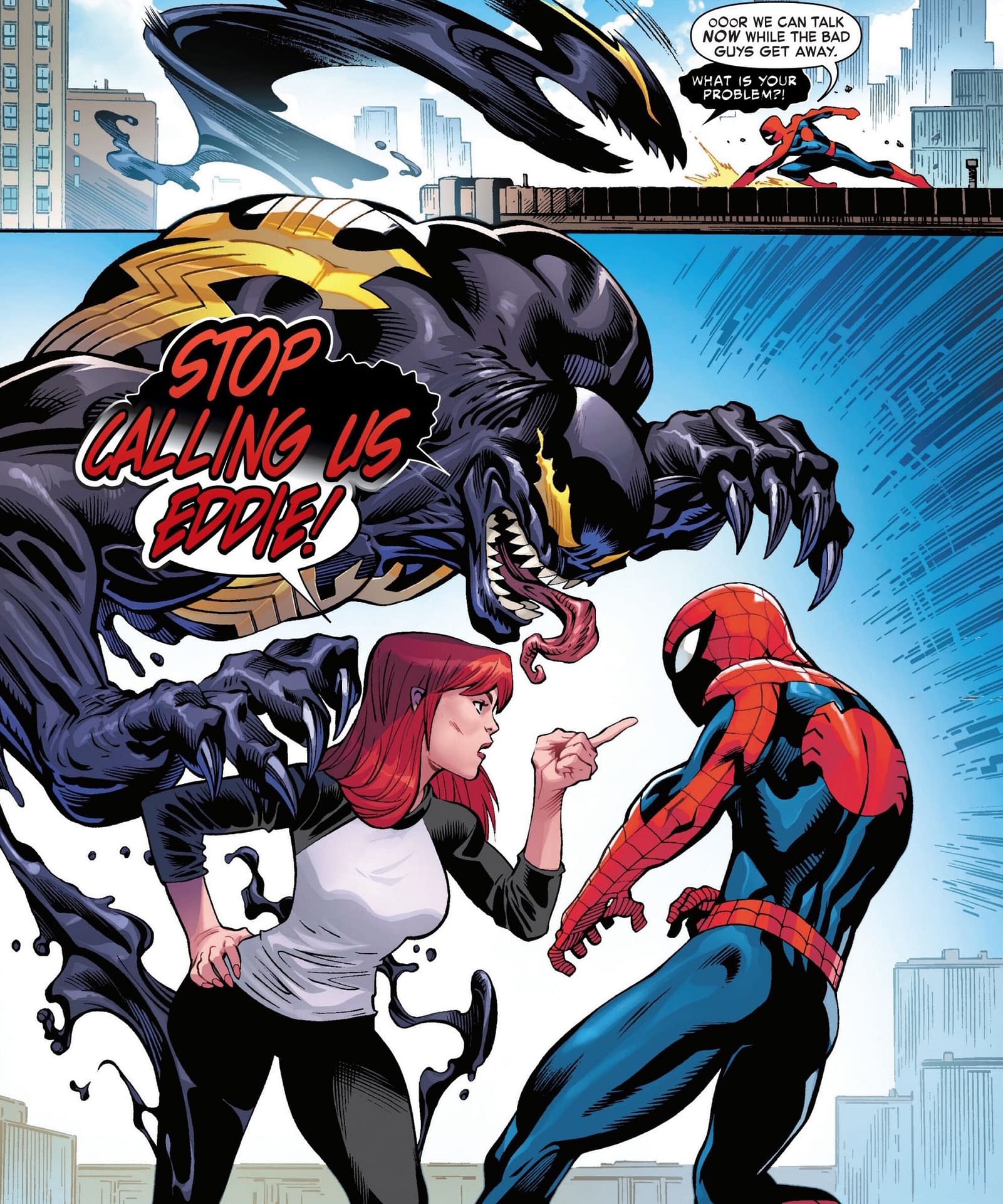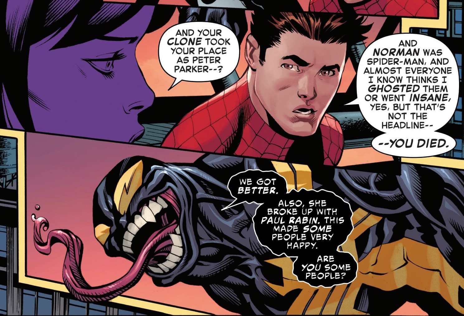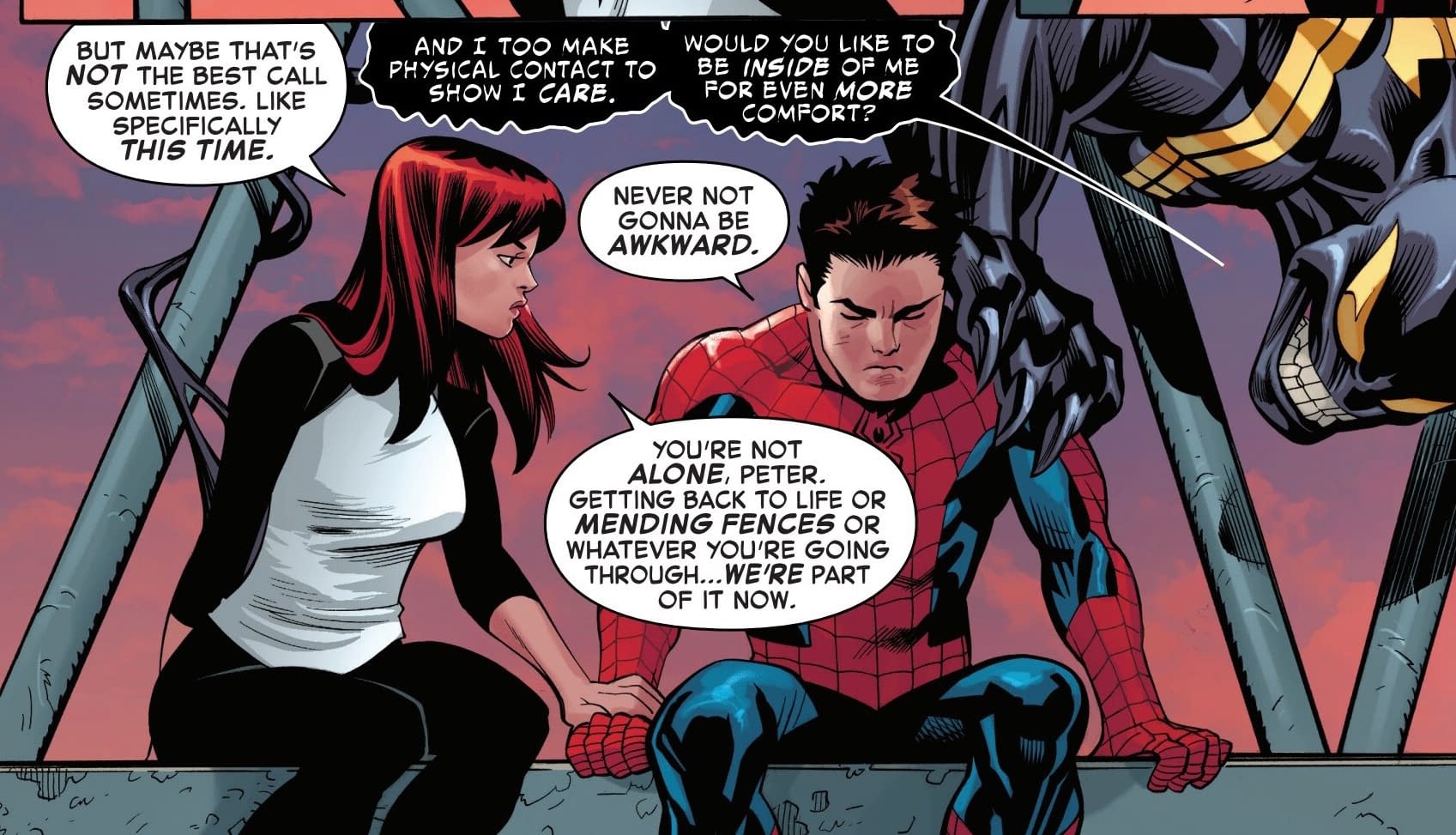 Did Venom just break the fourth wall there, in respect to a certain ex of Mary Jane Watson, Paul Rabin? I rather think he might have. Those "some people" seem to be everyone reading this comic book. Because as all true Spider-Man fans, know there has only been one person for Peter Parker…