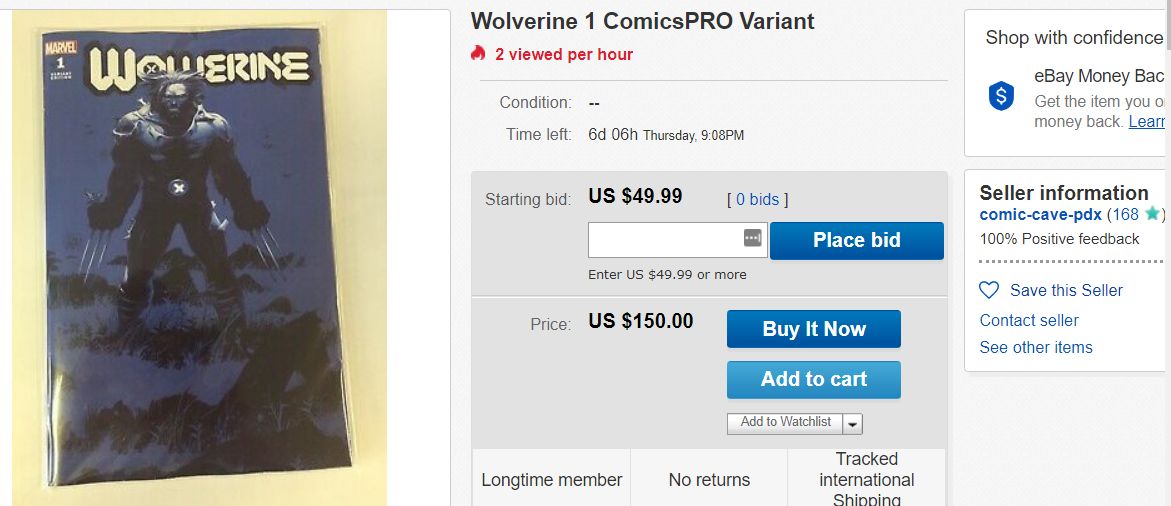 Expect a number of retailers to be flipping some of those on eBay… in fact, let's take a look now. Wolverine #1 with the ComicsPRO blue cover seems to be the one that most people are after… though no sales yet.