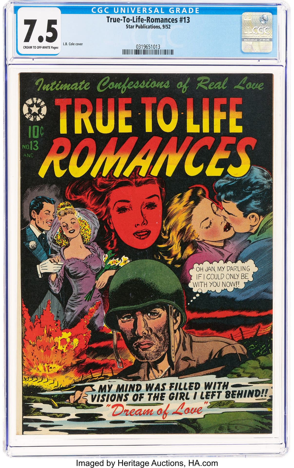True-to-Life Romances #13 might be one of L.B. Cole's most powerful romance covers. There are only 14 copies of this issue on the CGC census, with only three of those graded higher than this CGC VF- 7.5 Cream to off-white pages copy of True-to-Life Romances #13 (Star Publications, 1952) up for auction in the 2025 September 18 Golden Age Comics Century Showcase Auction II at Heritage Auctions.