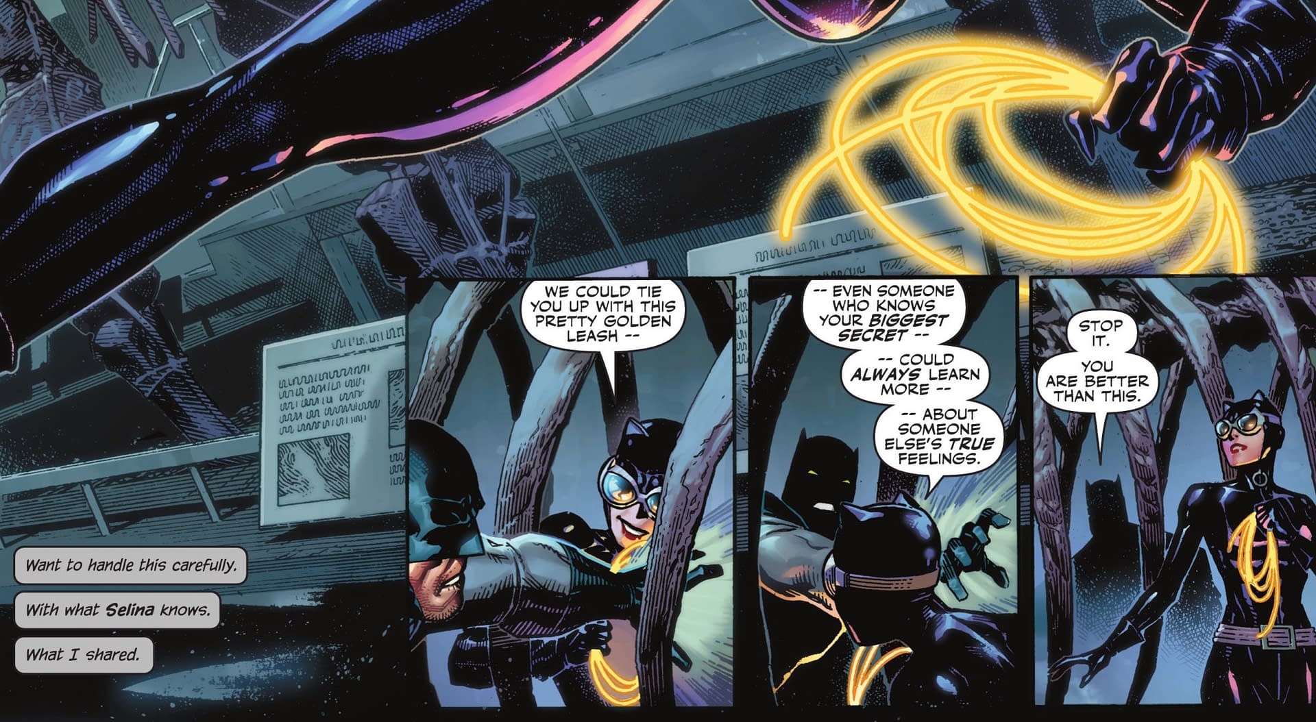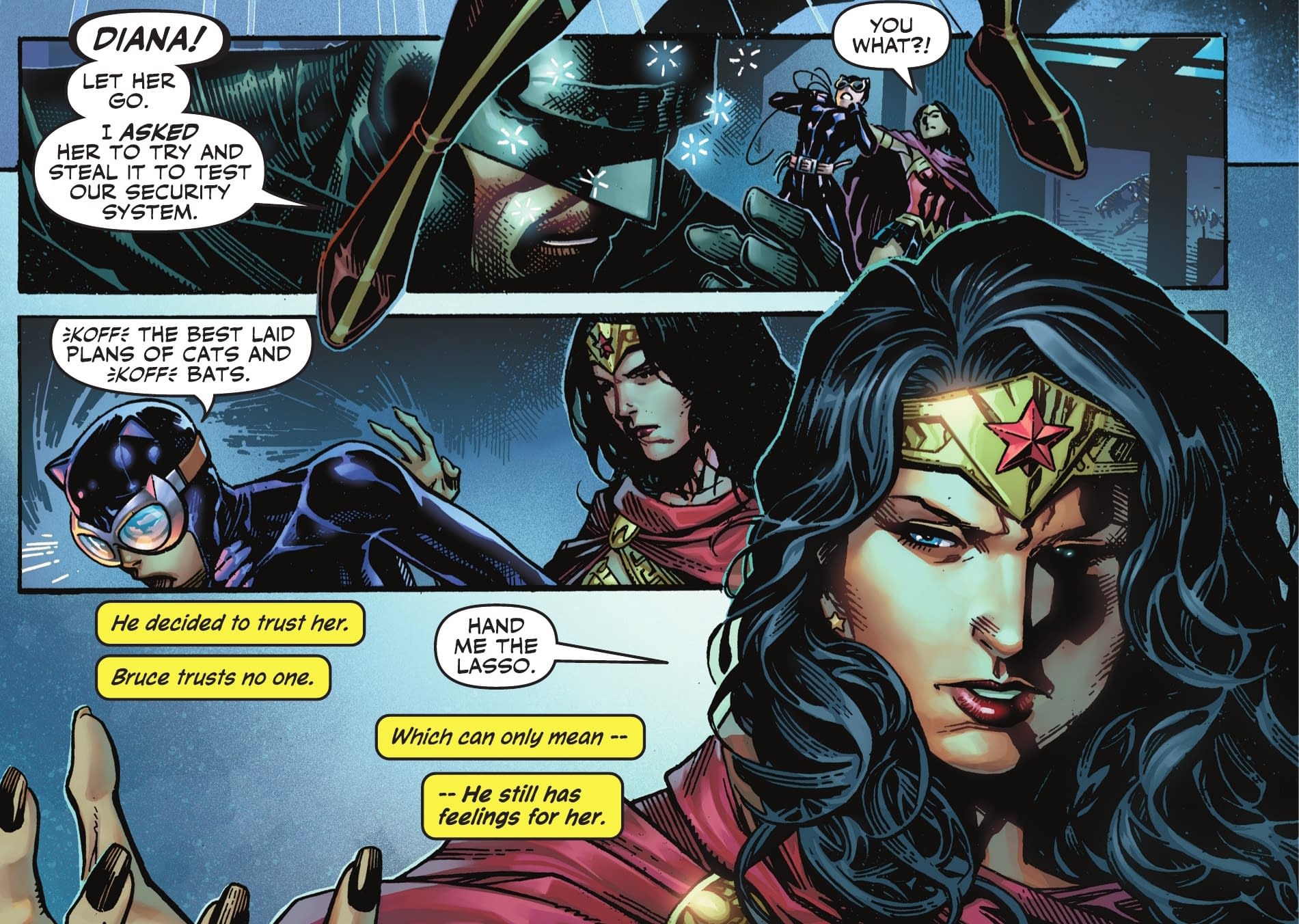 - Catwoman steals Wonder Woman’s Lasso of Truth, pulling Batman into a tense clash of trust, lies and old wounds.