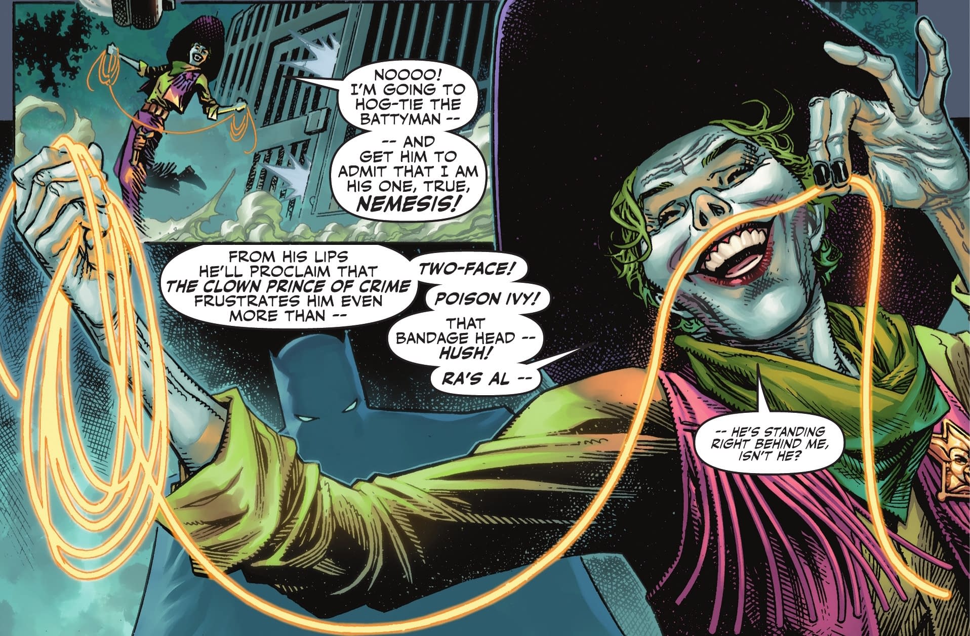 And so who has the lasso? Someone who really, really wants the truth. But again, not the truth you may expect. The Joker has no desire to know who Batman really is…