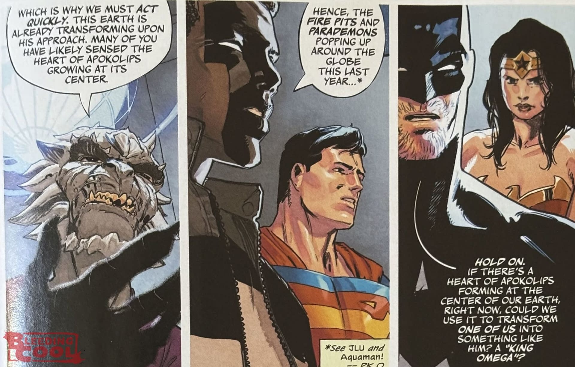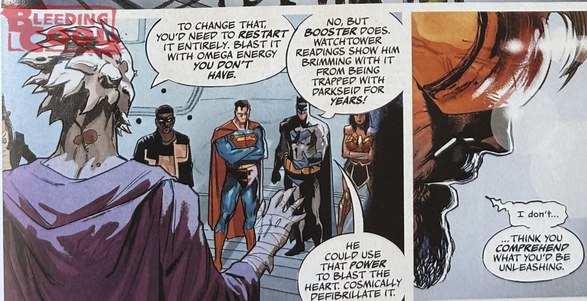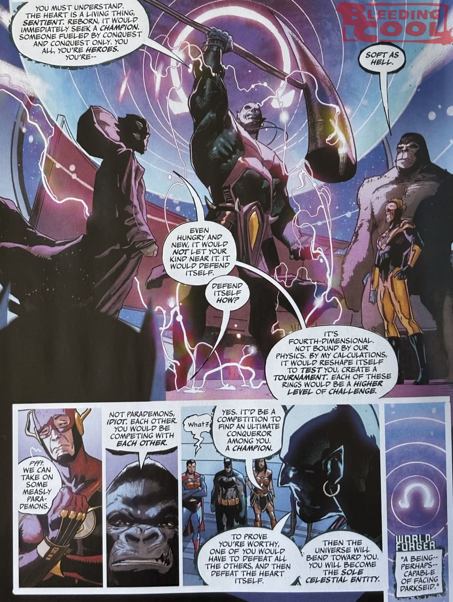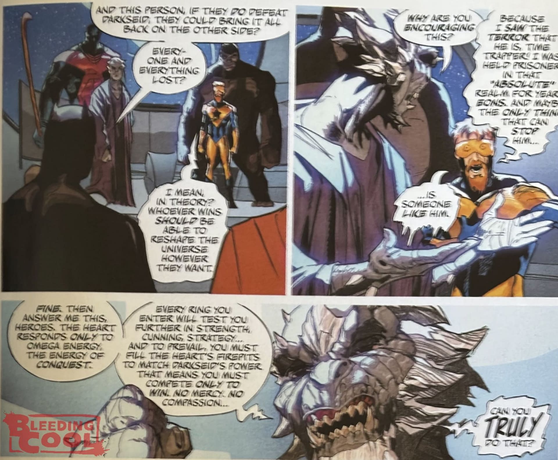 Scott Snyder had laid it all down. "So the event, as they get towards the heart of Apokolips, it tries to defend itself and creates a tournament, five levels, to see who is worthy of it. And so the only way to become worthy is to defeat other champions, to take down all of the other heroes, anyone else that's in this competition, and to do it in a way that shows no compassion, no mercy. Because if you start to help each other, if you start to try and be soft, then it won't create enough Omega energy and you won't be worthy. So it is a knockdown, drag out, fun battle royale to see who will be the standing champion at the end of the DC universe to be able to defeat Darkseid and bring everything back the way it's supposed to be." A sentient heart of Apokalips, and part of the whole sentient Omega particle thing in both the DC and the Absolute universe…