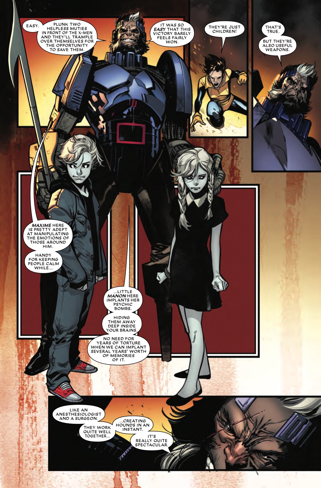In next week's Extermination #3, we finally find out what's up with those young mutant twins that the X-Men rescued from harassment by Marvel Editor Jordan White in Extermination #1. Well, actually, we find out what's up with them right now, because Marvel has release a preview for Extermination #3, and Ahab spills the beans: they're hounds, one with the power to manipulate emotions, and one with the power of expedient brainwashing (which is how Ahab was so quickly able to turn Old Man Logan into a hound in Extermination #2).