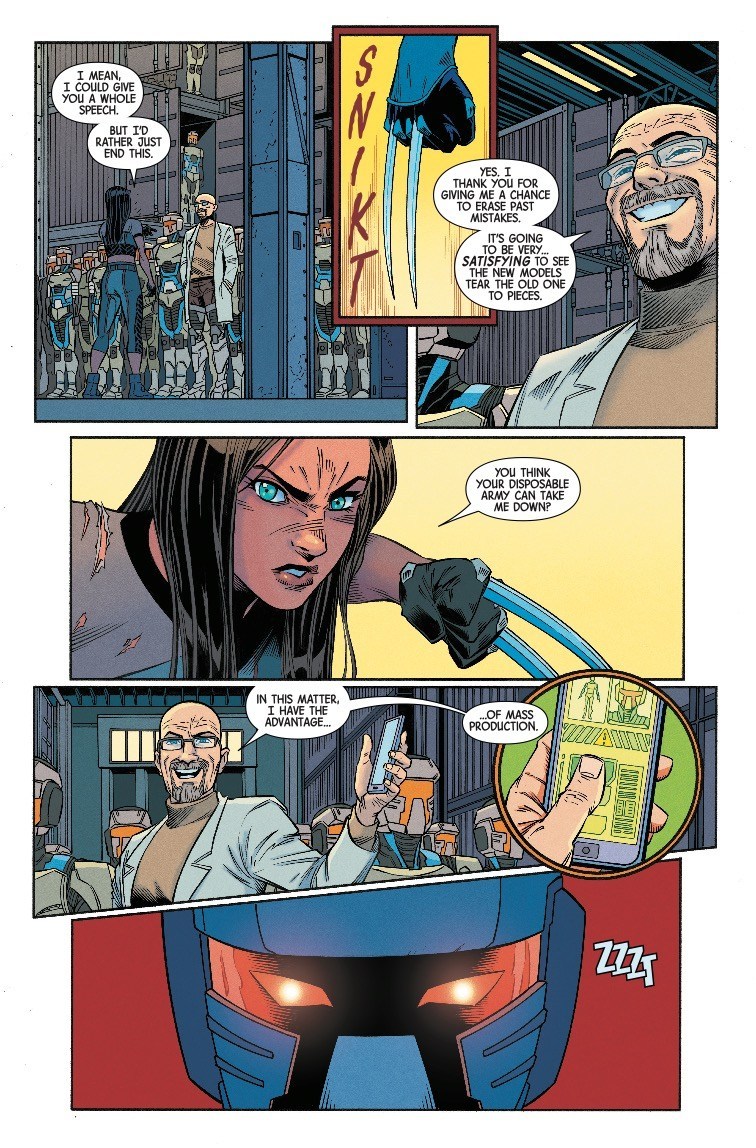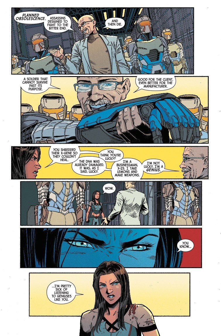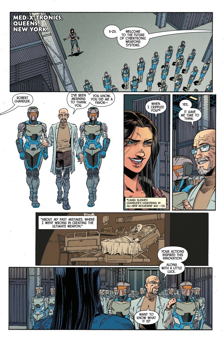 Things have been getting clone crazy for X-23 and Honey Badger in the pages of X-23 recently. The pair discovered yet another clone sister, except with damaged DNA that blocked her healing power. Making matters worse, the clones have been mass-produced as cybernetic killing machines, being sold as weapons by Robert Chandler, an eccentric entrepreneur with a very interesting idea for a tech startup…