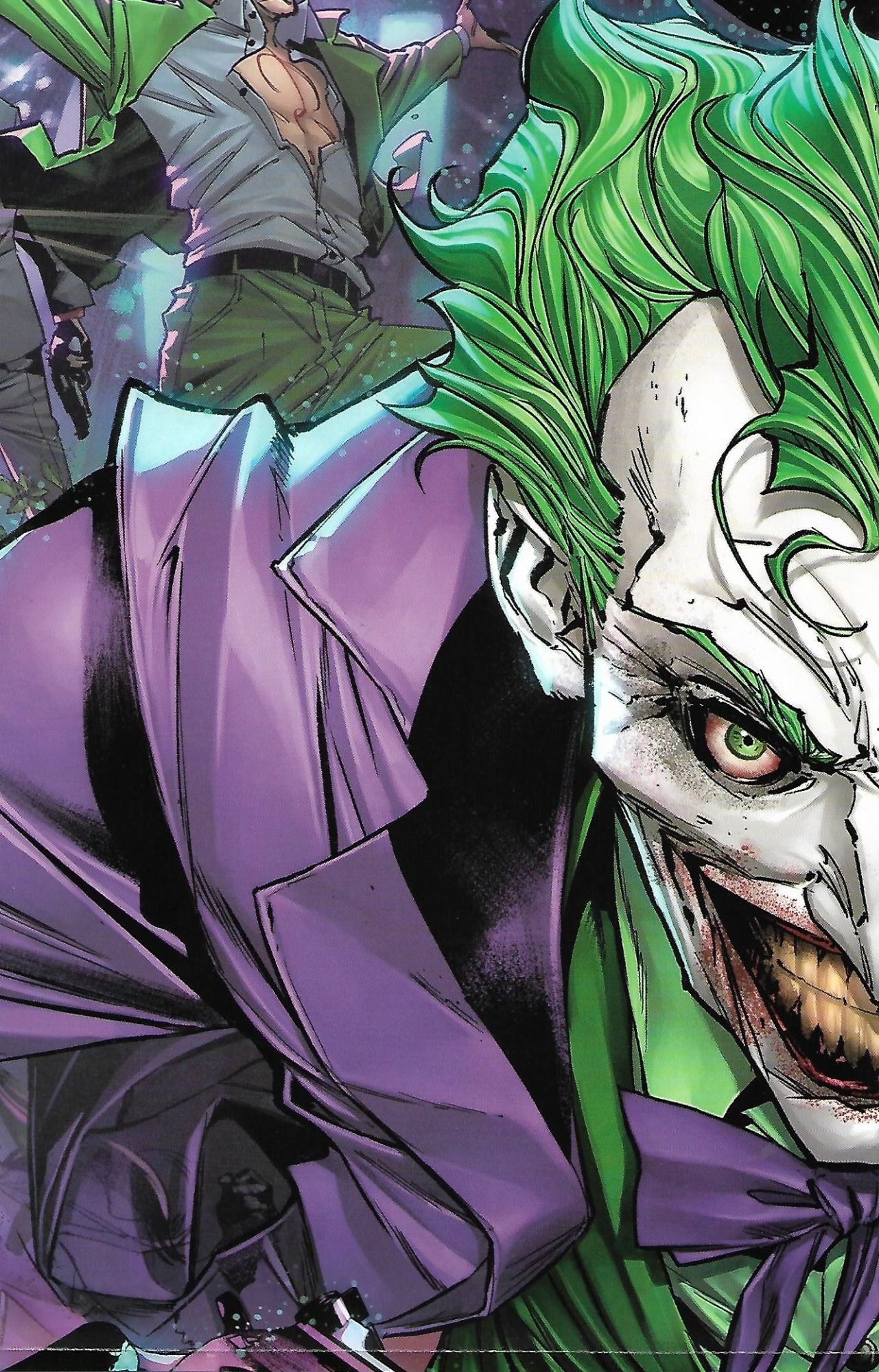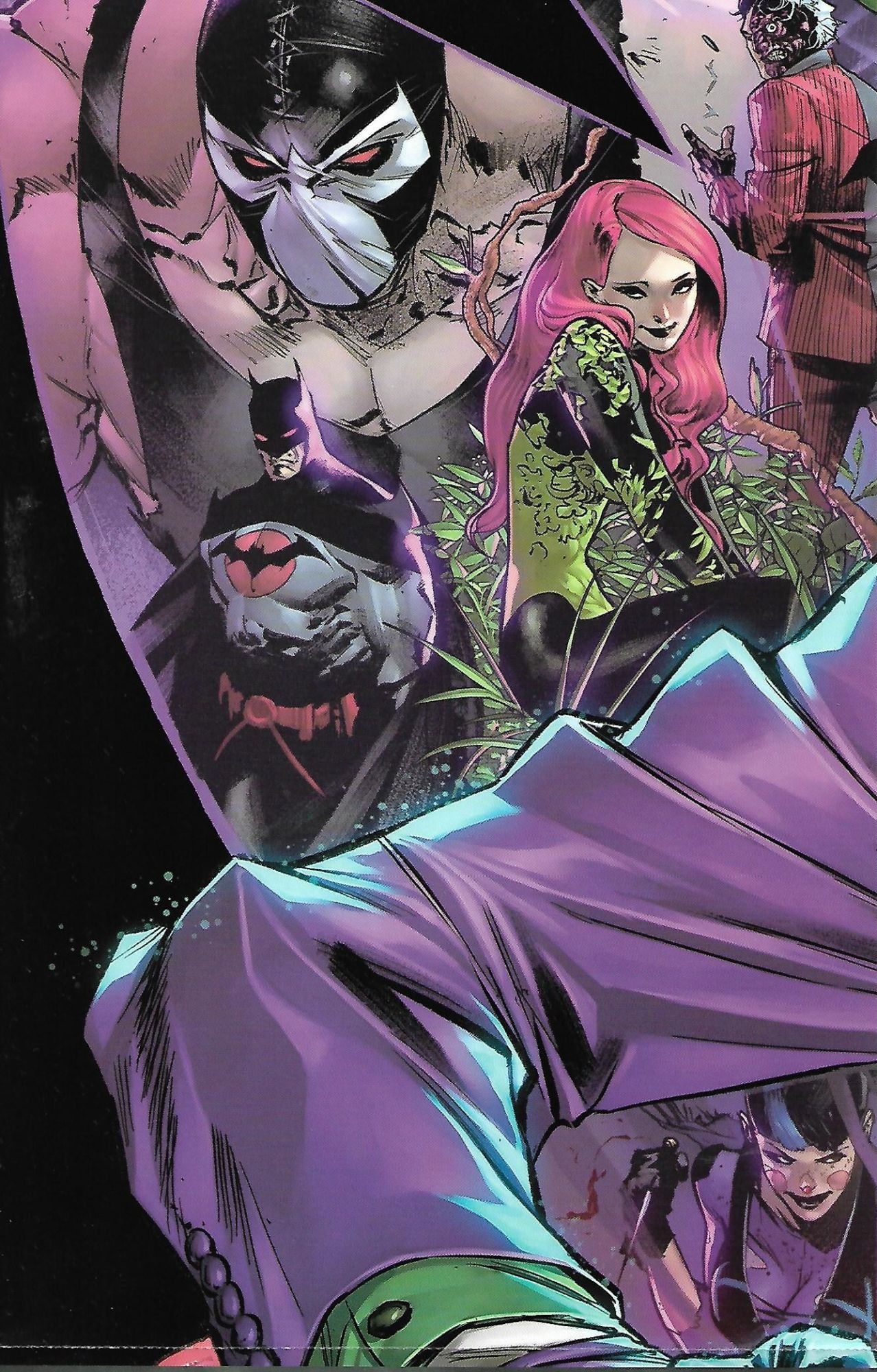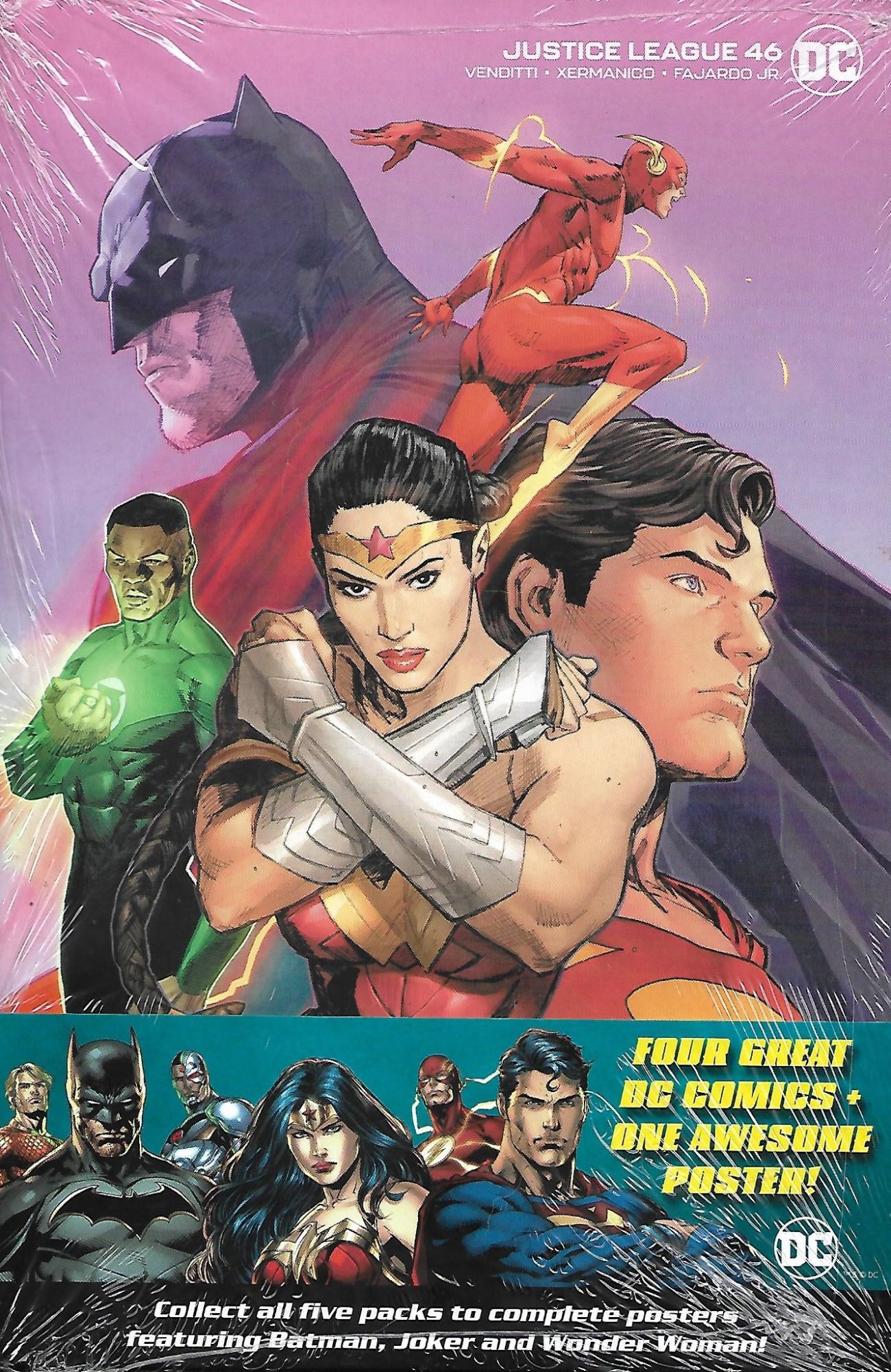 So like the last set, five packs were released late last week at Walmarts throughout the country. Each of the five packs contains four comics, one backing board with a part of the "poster" and costs about $9. Also, each pack contains the same mix of comics, so if one buys pack #1, the pack with Justice League #46 Variant Cover on top, has the same three comics behind it. Same for the other four packs. One difference from the last packs, though, is that the "poster" on the backing boards this time consists of four parts, with the poster included with pack #5 being a separate Wonder Woman image by Nicola Scott. Parts one through four from the other packs, when put together, make the Joker War image done by Jorge Jimenez for Batman #100, though formatted and streamlined to fit the four-piece format. Besides having a Batman-centric poster, three of the packs have Batman comics as the top comic, as DC's emphasis that Batman sells is on full display.