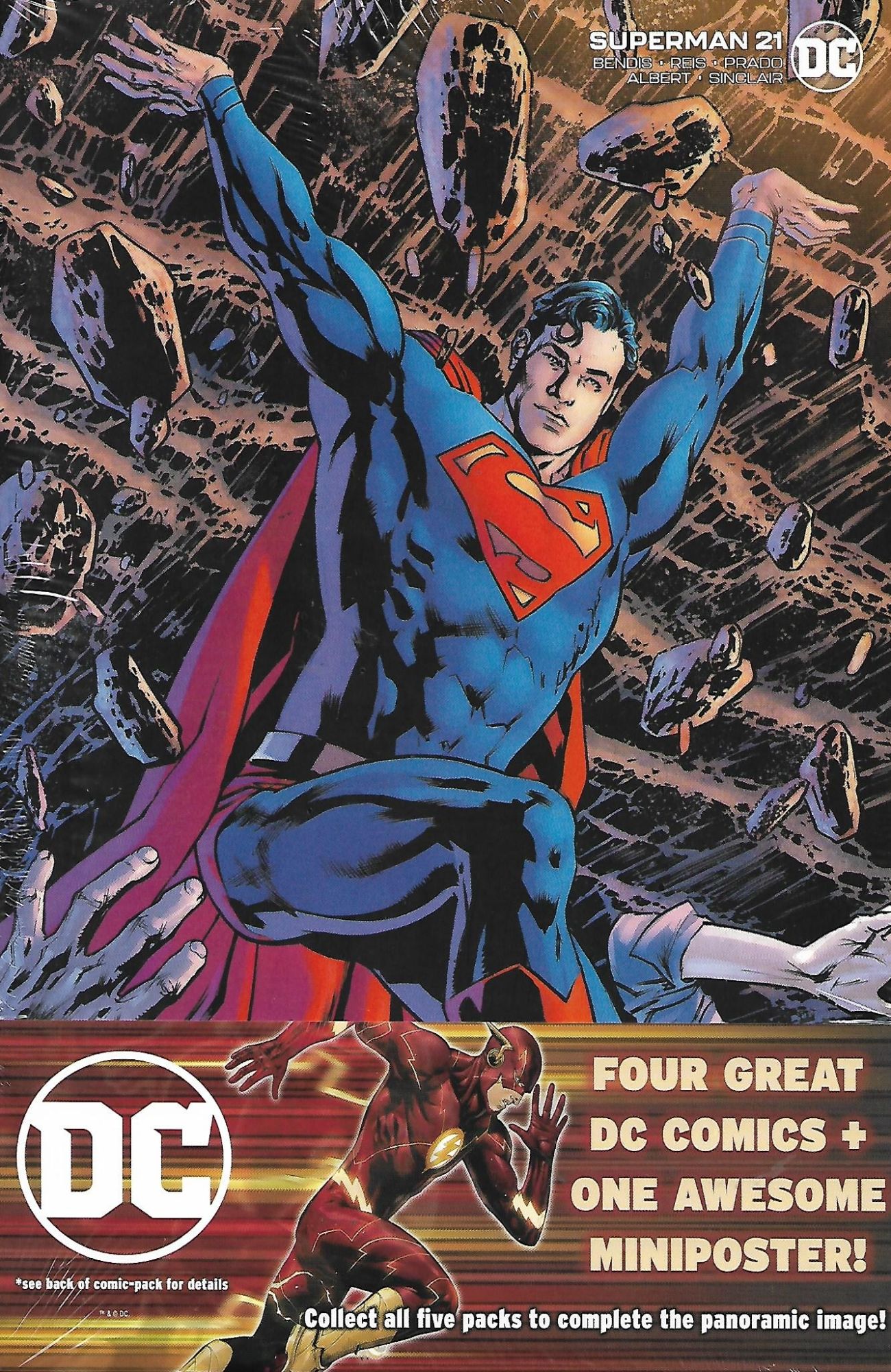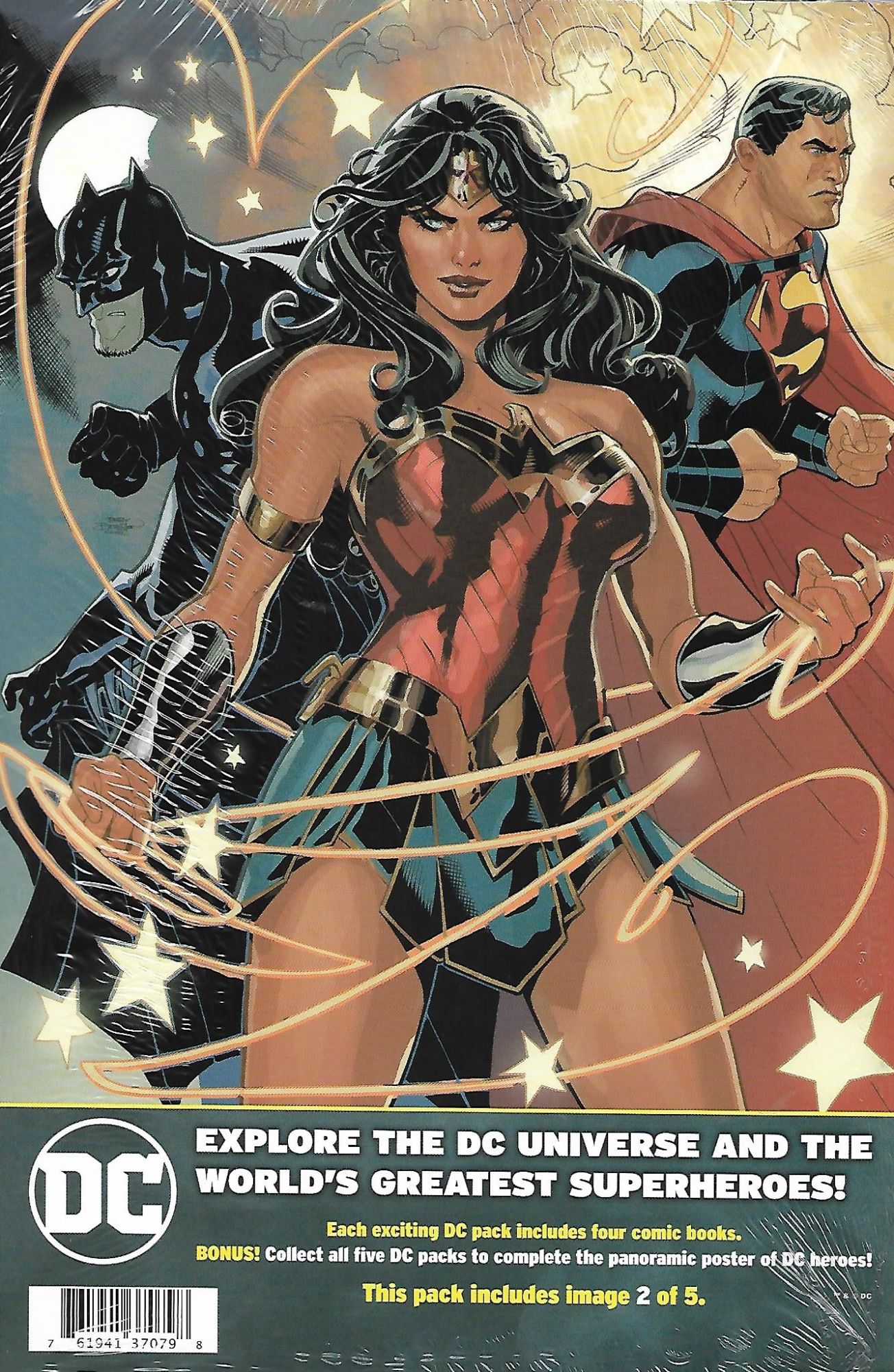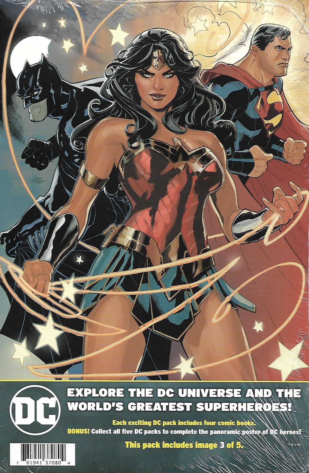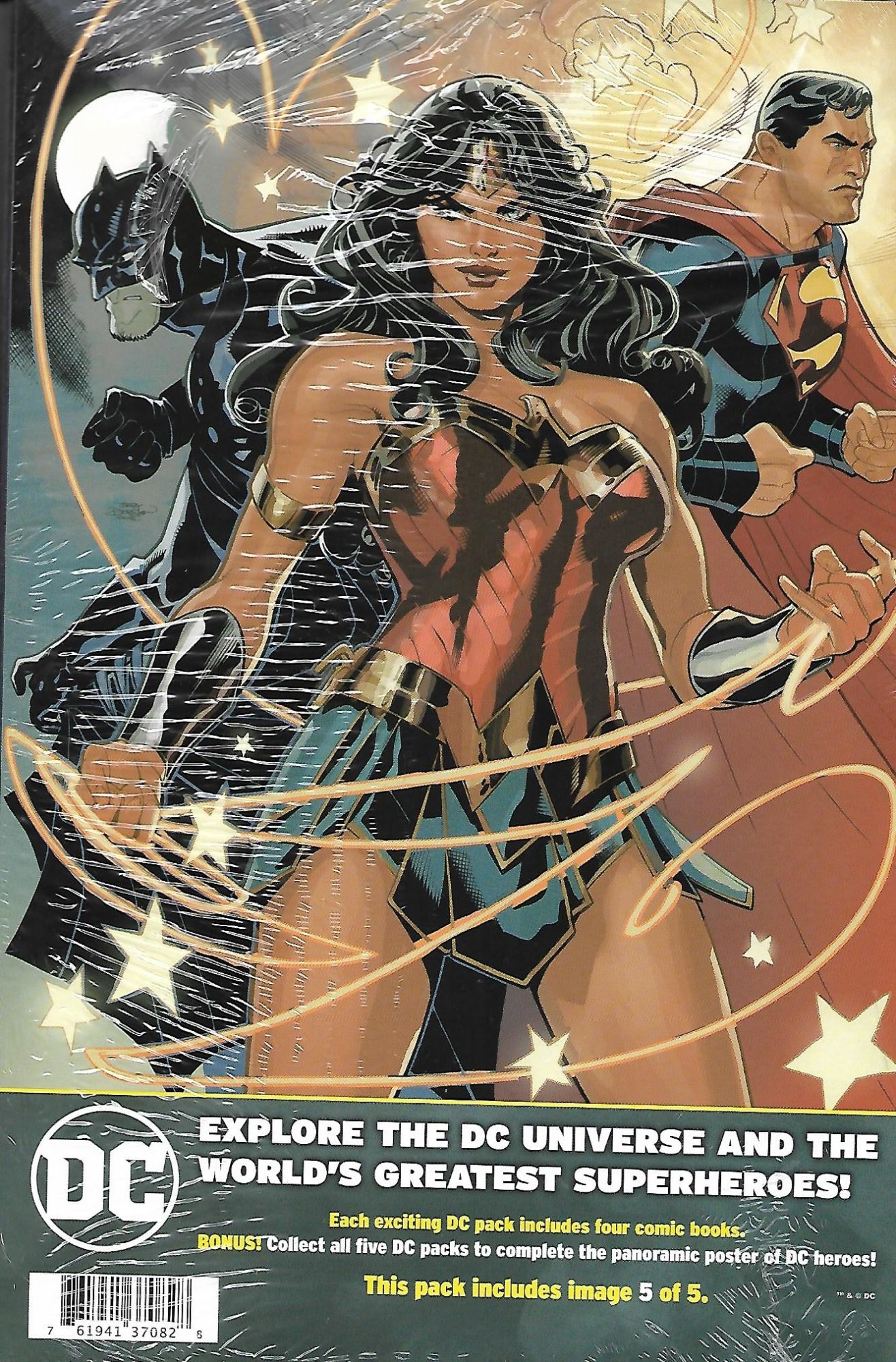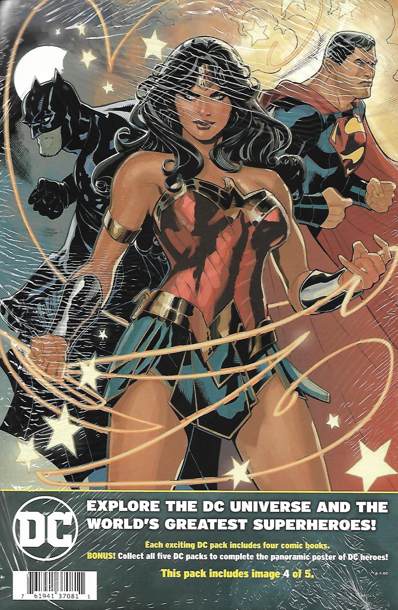 Each four pack of comics focuses on one DC character / team, with one Batman pack, one Superman pack, one Wonder Woman pack, one Aquaman pack, and one Justice League pack. This branding is even obvious when they are rung up at the check out counter, as the Batman pack rings up as DC Batman Four Pack, and so on. Costing $8.98 per pack each pack contains one main comic shown, and three comics behind it, shrink wrapped with a backing board display, using some great Terry Dodson artwork from Justice League Volume 4 #28, stating "each exciting DC pack includes four comic books. BONUS! Collect all five DC packs to complete the panoramic poster of the DC heroes!" Under that blurb each pack is labeled as including image __ of five, with the Batman pack being 1 of 5, the Justice League pack being 2 of 5, the Superman pack being 3 of 5, the Aquaman pack being 4 of 5, and the Wonder Woman pack being 5 of 5.